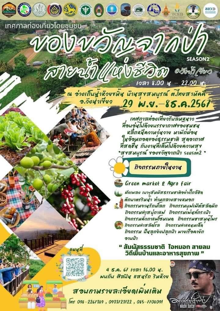 การท่องเที่ยวแห่งประเทศไทย สำนักงานนครราชสีมา เชิญเที่ยวงานเทศกาล ของขวัญจากป่า season 2 ตอนสายน้ำแห่งชีวิต ระหว่าง วันที่ 29 พฤศจิกายน – 8 ธันวาคม 2567 เวลา 8.00 – 22.00 น. ณ อ่างเก็บน้ำหัวยขมิ้น บ้านสุขสมบูรณ์ ต.ไทยสามัคคี อ.วังน้ำเขียว