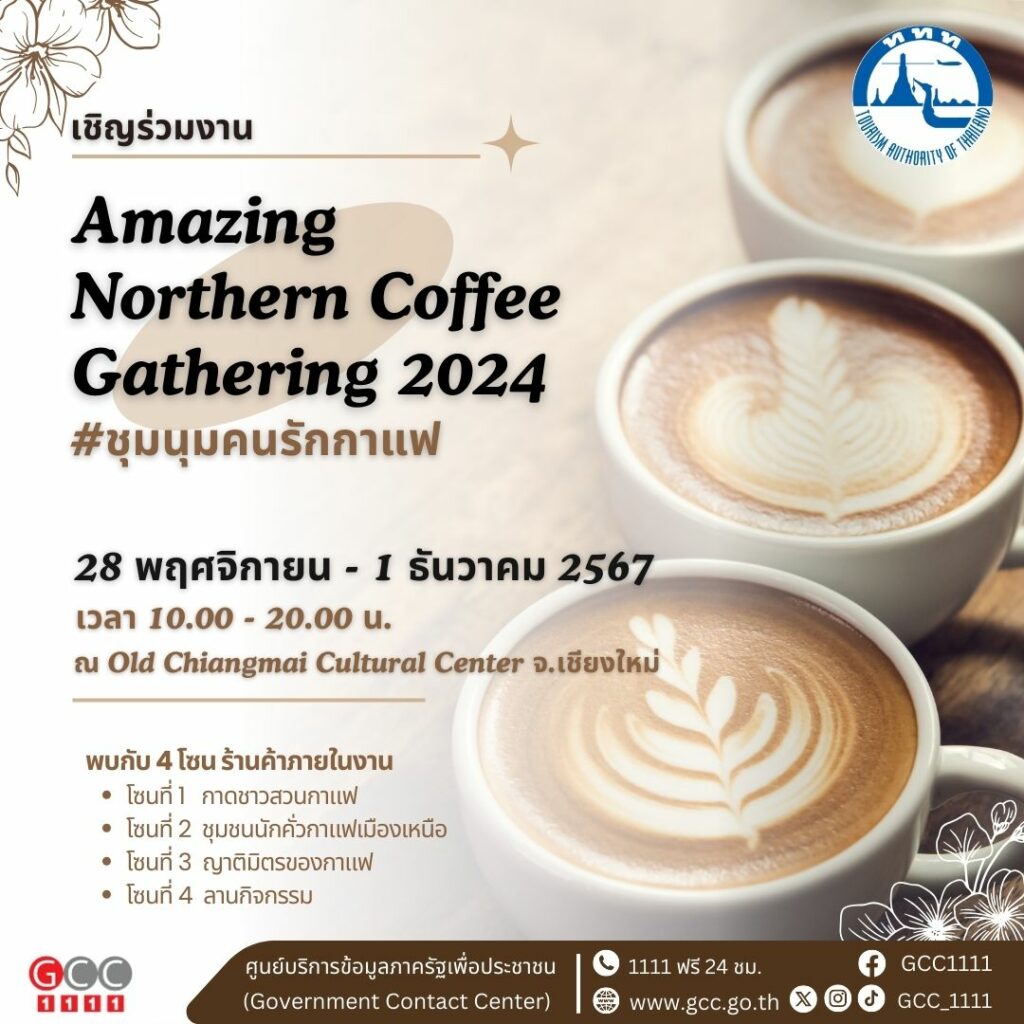 การท่องเที่ยวแห่งประเทศไทย เชิญร่วมงาน Amazing Northern Coffee Gathering 2024 #ชุมนุมคนรักกาแฟ วันที่ 28 พฤศจิกายน – 1 ธันวาคม 2567 เวลา 10.00 – 20.00 น. ณ  Old Chiangmai Cultural Center จ.เชียงใหม่