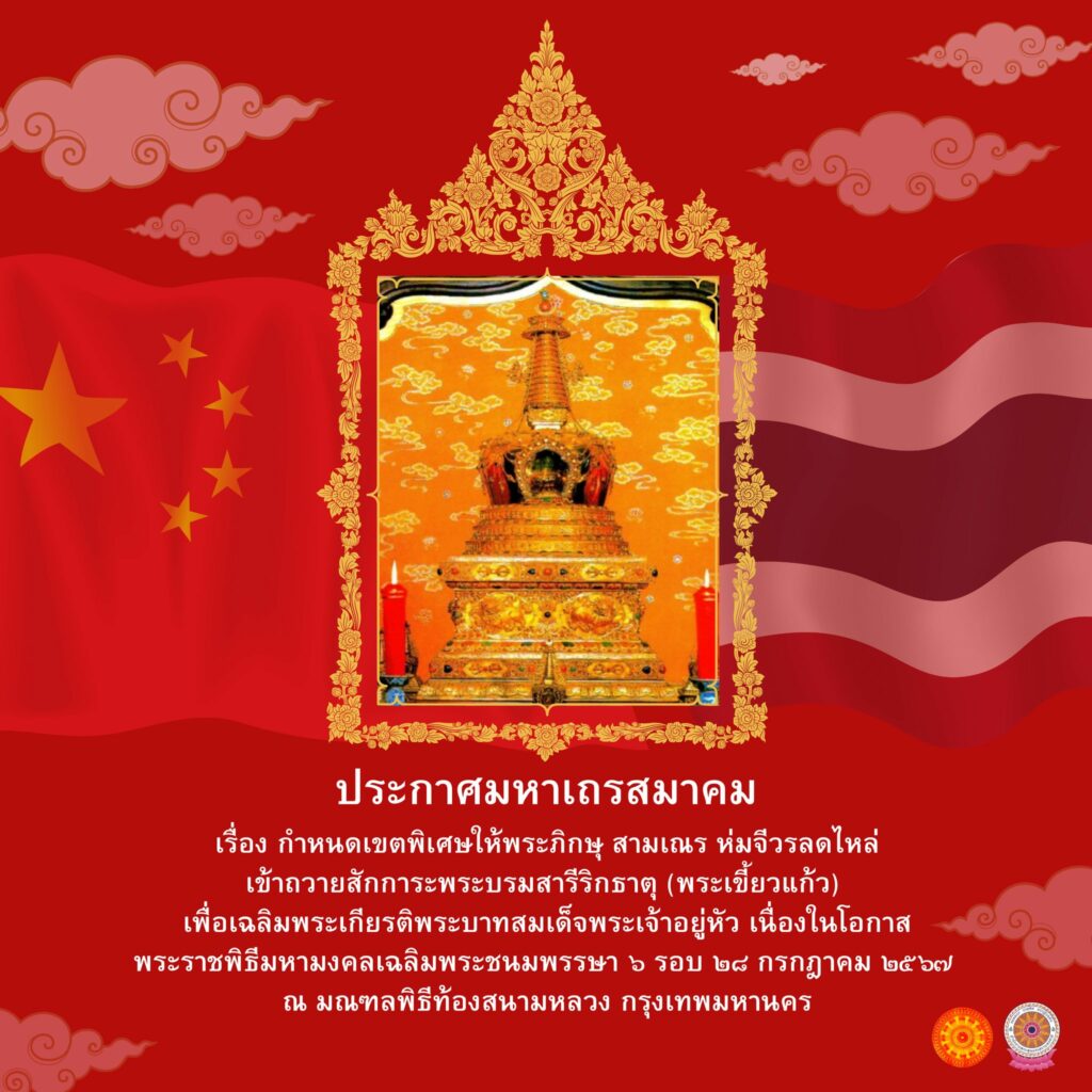 ด้วยมหาเถรสมาคม ได้มีมติครั้งที่ 26/2567 มติที่ 810/2567 เมื่อวันที่ 10 ตุลาคม 2567 รับทราบโครงการอัญเชิญพระบรมสารีริกธาตุ (พระเขี้ยวแก้ว) จากสาธารณรัฐประชาชนจีนมาประดิษฐานในราชอาณาจักรไทยเป็นการชั่วคราว เพื่อเฉลิมพระเกียรติพระบาทสมเด็จพระเจ้าอยู่หัว เนื่องในโอกาสพระราชพิธีมหามงคลเฉลิมพระชนมพรรษา 6 รอบ 28 กรกฎาคม 2567 ซึ่งจัดโดยรัฐบาล และเบิดโอกาสให้ พระภิกษุ สามเณร และพุทธศาสนิกชนทั้งชาวไทยและต่างประเทศ เข้าถวายสักการะพระบรมสารีริกธาตุ (พระเขี้ยวแก้ว) เพื่อความเป็นสิริมงคล ณ มณฑลพิธีท้องสนามหลวง กรุงเทพมหานคร ระหว่างวันที่ 4 ธันวาคม 2567 ถึงวันที่ 14 กุมภาพันธ์ 2568