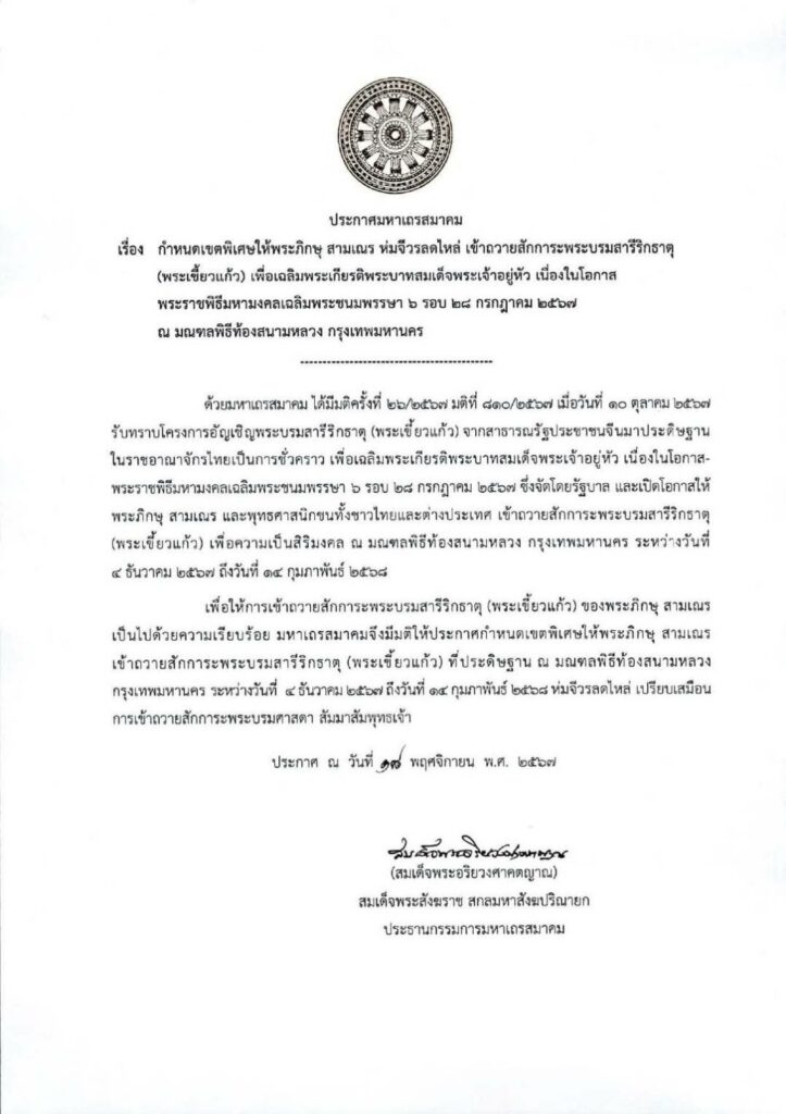 ประกาศมหาเถรสมาคม เรื่อง กำหนดเขตพิเศษให้พระภิกษุ สามเณร ห่มจีวรลดไหล่ เข้าถวายสักการะพระบรมสารีริกธาตุ (พระเขี้ยวแก้ว) เพื่อเฉลิมพระเกียรติพระบาทสมเด็จพระเจ้าอยู่หัว เนื่องในโอกาสพระราชพิธีมหามงคลเฉลิมพระชนมพรรษา 6 รอบ 28 กรกฎาคม 2567 ณ มณฑลพิธีท้องสนามหลวง กรุงเทพมหานคร