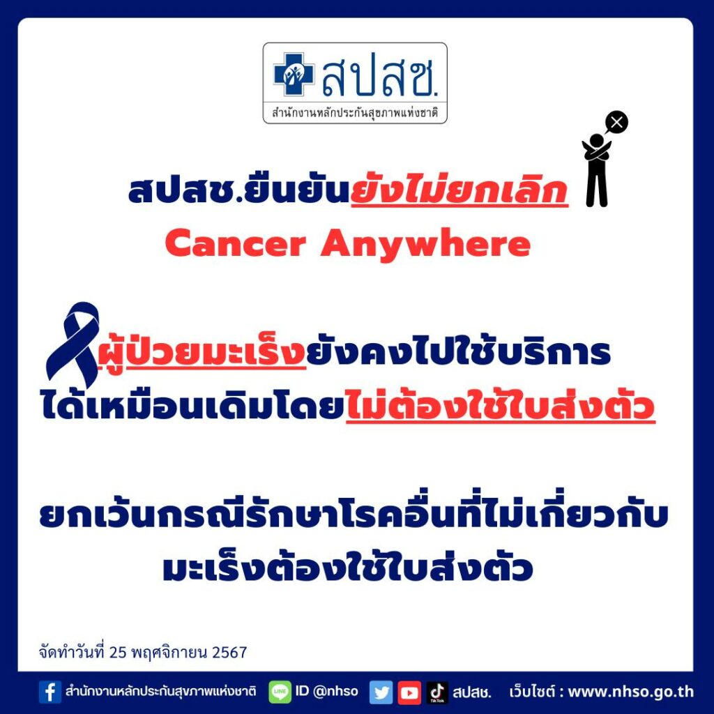 สำนักงานหลักประกันสุขภาพแห่งชาติ ยืนยัน ยังไม่ยกเลิก Cancer Anywhere ผู้ป่วยมะเร็ง ยังคงไปใช้บริการได้เหมือนเดิมโดย ไม่ต้องใช้ใบส่งตัว ยกเว้นกรณีรักษาโรคอื่นที่ไม่เกี่ยวกับมะเร็งต้องใช้ใบส่งตัว