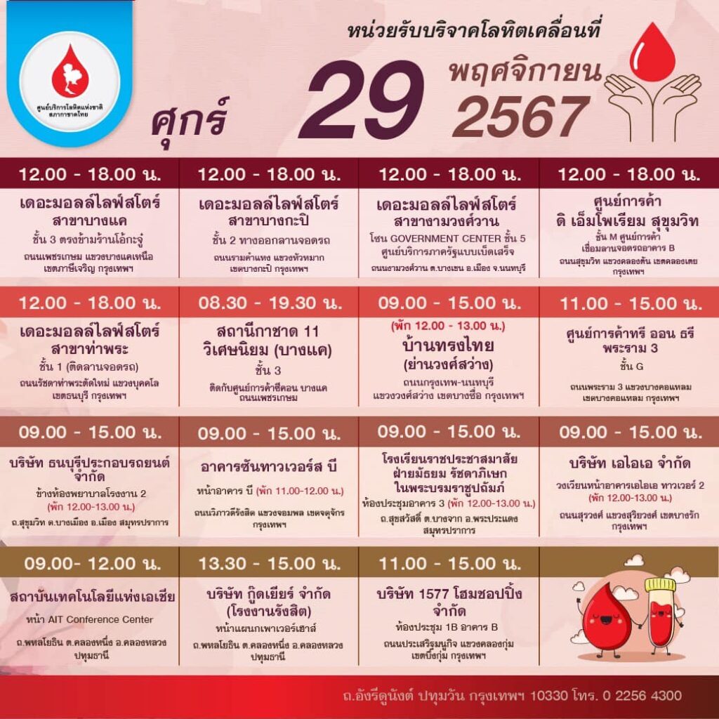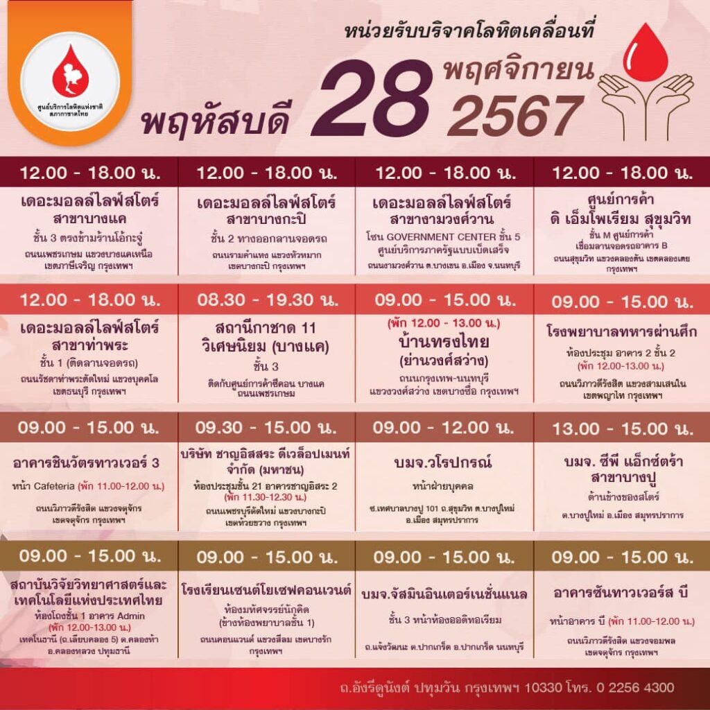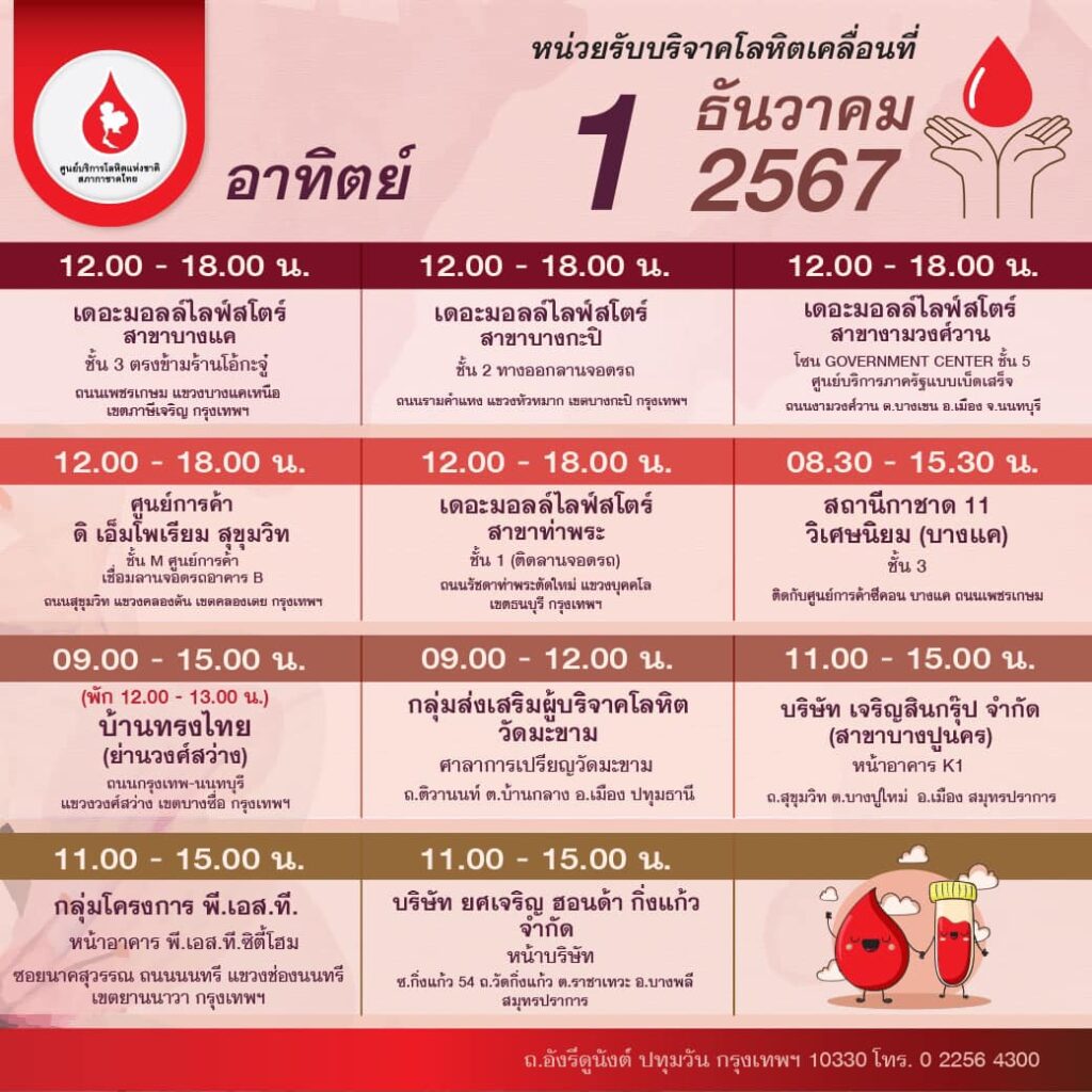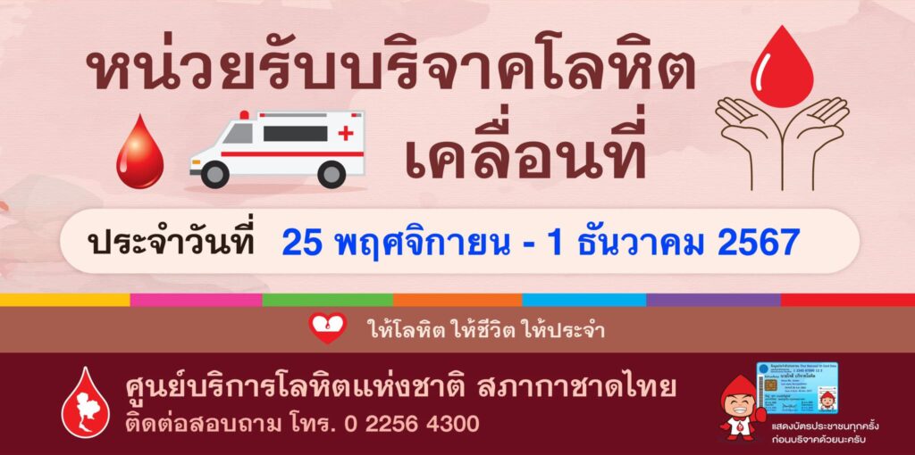 สภากาชาดไทย ออกหน่วยรับบริจาคโลหิตเคลื่อนที่ วันที่ 25 พฤศจิกายน – 1 ธันวาคม 2567