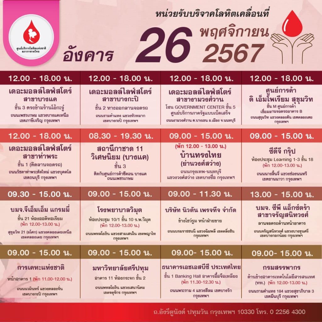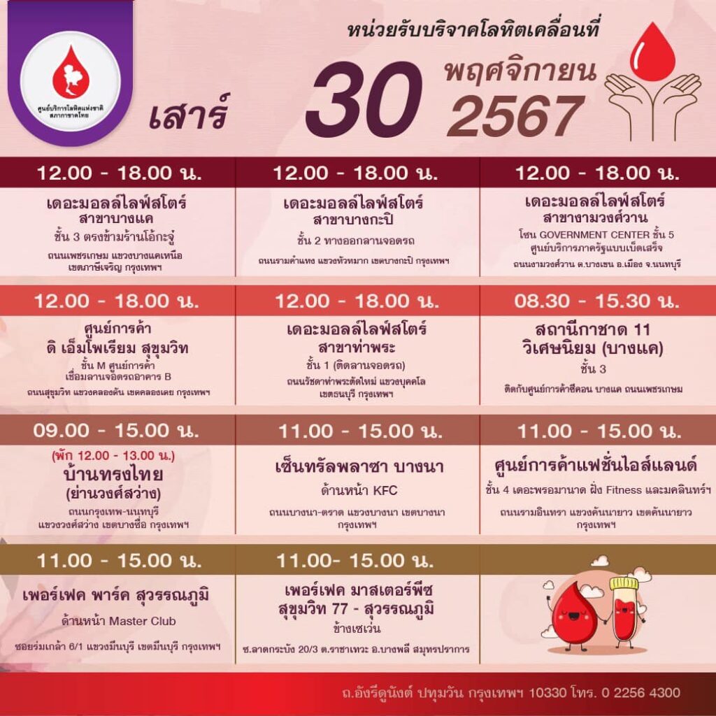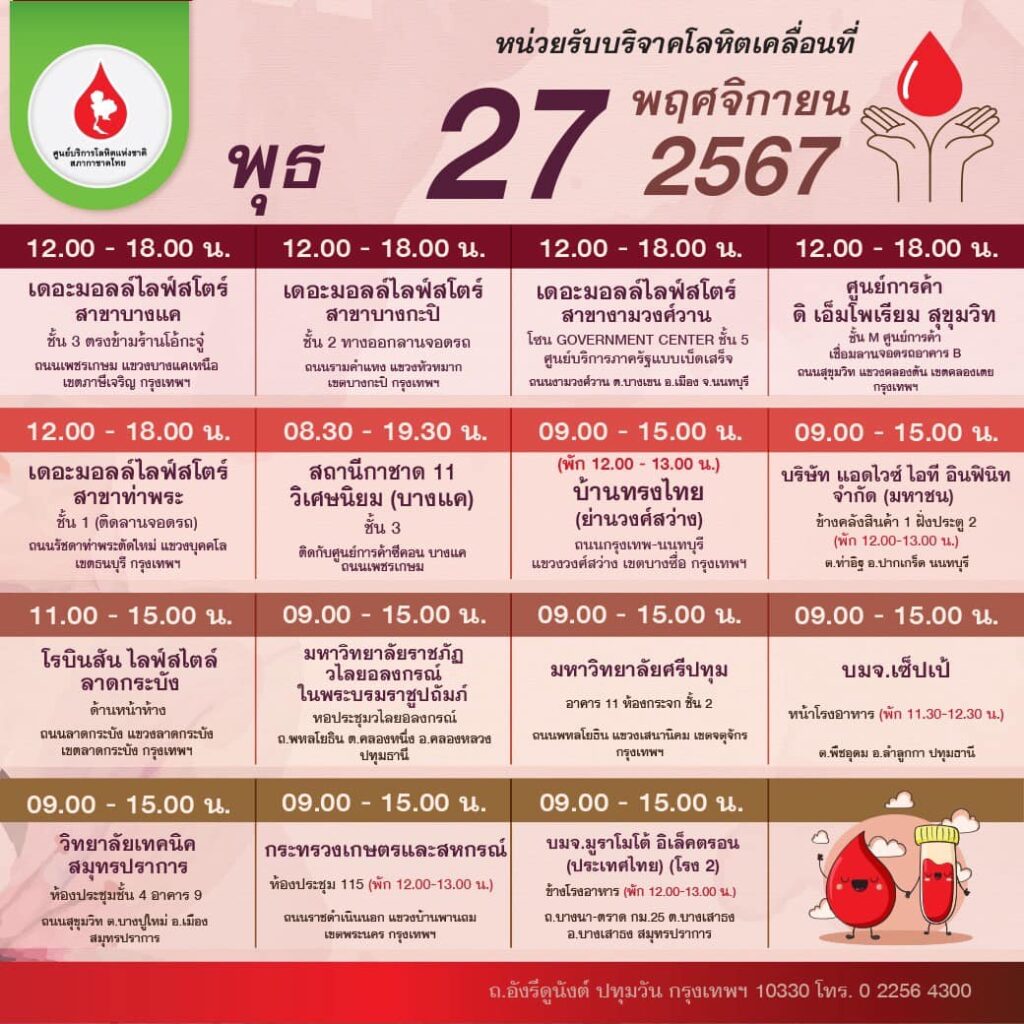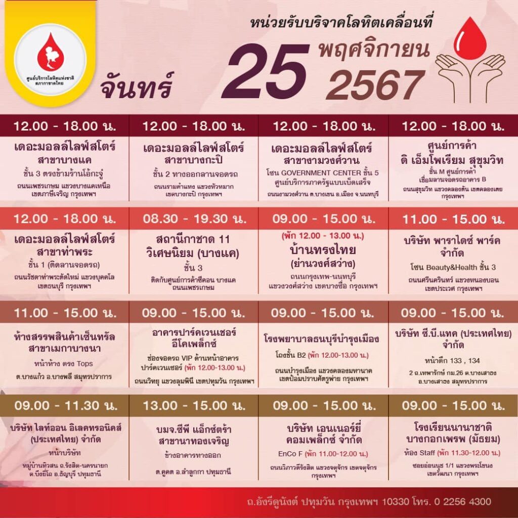 สภากาชาดไทย ออกหน่วยรับบริจาคโลหิตเคลื่อนที่ วันที่ 25 พฤศจิกายน – 1 ธันวาคม 2567
