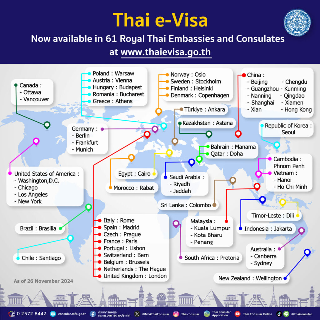 กรมการกงสุล กระทรวงการต่างประเทศ ได้เปิดให้บริการระบบตรวจลงตราอิเล็กทรอนิกส์ (e-Visa) ณ สถานเอกอัครราชทูตและสถานกงสุลใหญ่ไทยในต่างประเทศ ปัจจุบันรวม 61 แห่ง โดยชาวต่างชาติที่อยู่ในประเทศหรือดินแดน/เขตอาณา/จุดติดต่อที่สถานเอกอัครราชทูตและสถานกงสุลใหญ่ดังกล่าวตั้งอยู่ สามารถขอรับการตรวจลงตราผ่านระบบ e-Visa ได้ที่ www.thaievisa.go.th