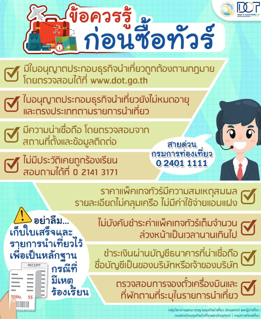 - กรมการท่องเที่ยว ขอแนะนำข้อควรรู้ก่อนซื้อทัวร์ เพื่อให้นักท่องเที่ยวใช้ประกอบการพิจารณาเลือกซื้อแพ็คเกจทัวร์