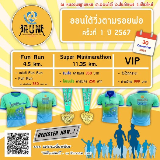 การท่องเที่ยวแห่งประเทศไทย สำนักงานเชียงใหม่ เชิญชวนวิ่งส่งท้ายปี 2567 กับกิจกรรม “ออนใต้วิ่งตามรอยพ่อ ครั้งที่ 1” ในวันที่ 30 ธันวาคม 2567 เวลา 06.00 น. เป็นต้นไปพบกับบรรยากาศร่มรื่นบนอ่างเก็บน้ำห้วยลานในพระราชดำริ ร. 9 และสัมผัสกับวิถีชีวิตชุมชนตำบลออนใต้ ในช่วงฤดูหนาว รับสมัครตั้งแต่บัดนี้ – 10 ธันวาคม 2567 โดย Scan QR-Code หรือ https://docs.google.com/…/1FAIpQLSfIBU…/viewform… สอบถามรายละเอียดเพิ่มเติมได้ที่ โทร. 0946291058 (หมอนุ้ย)