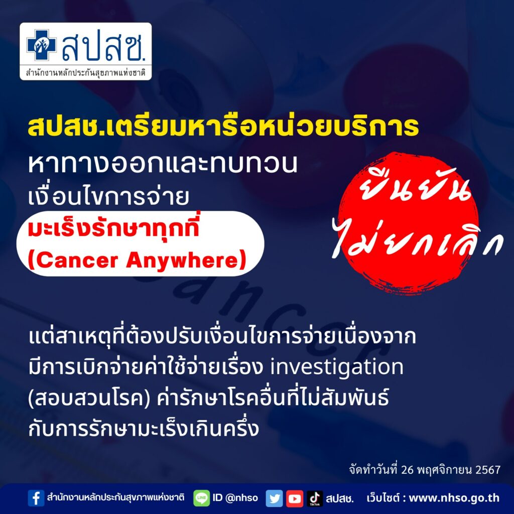 สปสช. เตรียมหารือหน่วยบริการหาทางออกและทบทวนเงื่อนไขการจ่ายมะเร็งรักษาทุกที่ (Cancer Anywhere) ยืนยันไม่ยกเลิก Cancer Anywhere แต่สาเหตุที่ต้องปรับเงื่อนไขการจ่ายเนื่องจากมีการเบิกจ่ายค่าใช้จ่ายเรื่อง investigation (สอบสวนโรค) ค่ารักษาโรคอื่นที่ไม่สัมพันธ์กับการรักษามะเร็งเกินครึ่ง
