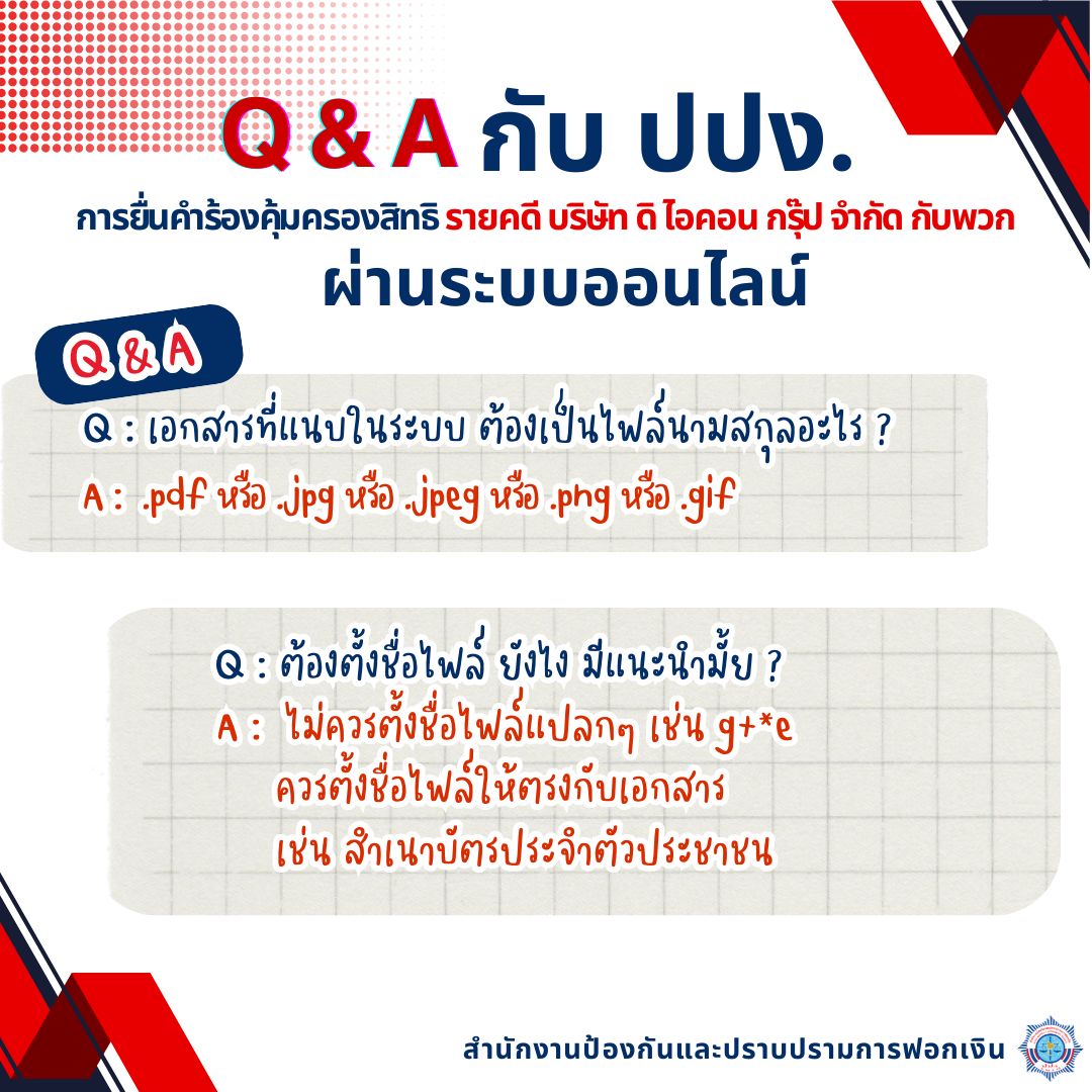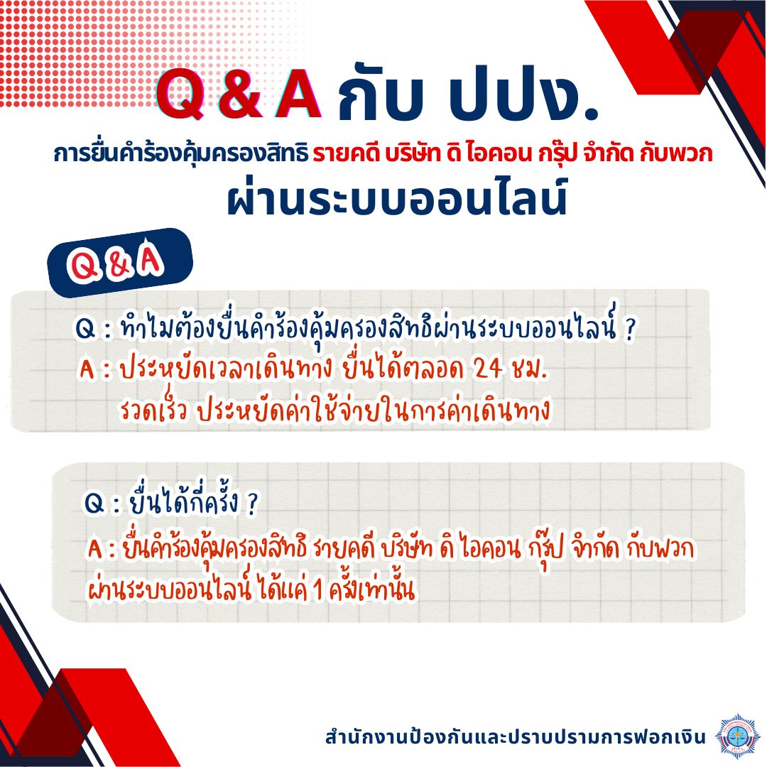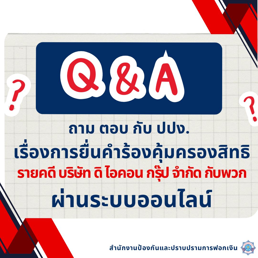 สำนักงาน ปปง. แนะนำ Q&A ถาม ตอบ กับ ปปง. เรื่องการยื่นคำร้องคุ้มครองสิทธิ รายคดี บริษัท ดิไอคอน กรุ๊ป จำกัด กับพวกผ่านระบบออนไลน์