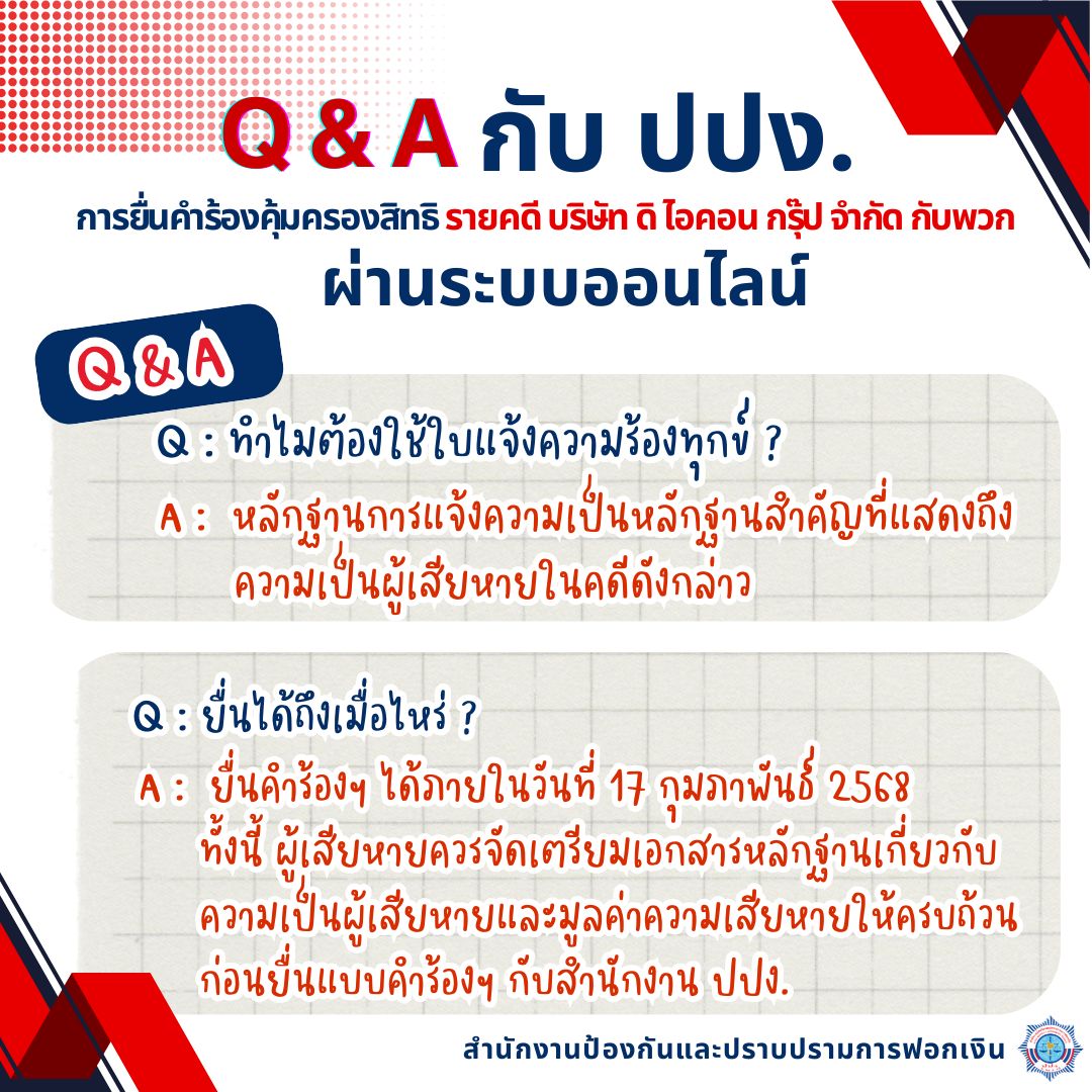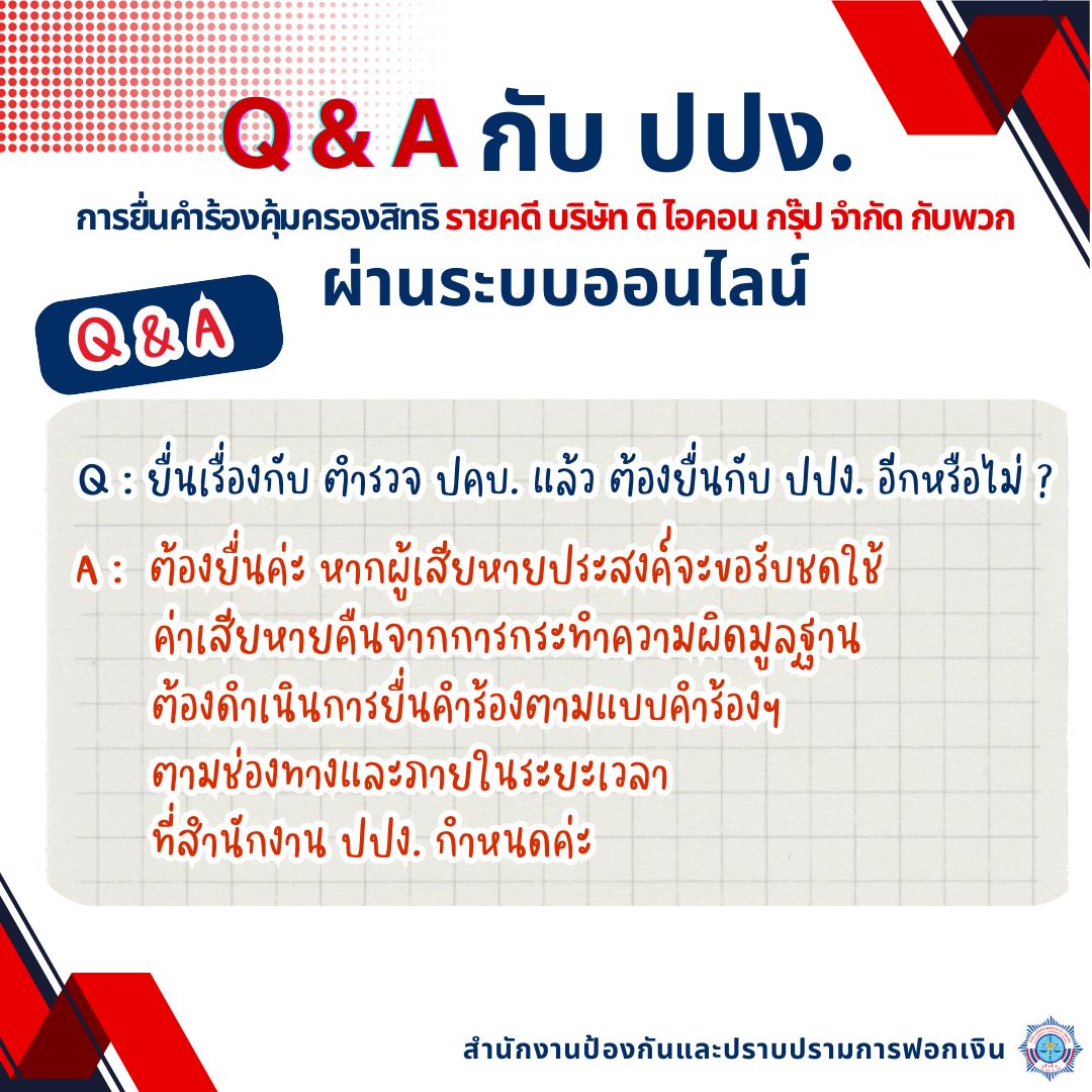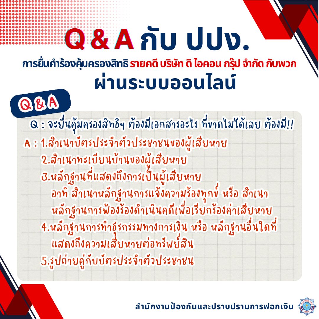 สำนักงาน ปปง. แนะนำ Q&A ถาม ตอบ กับ ปปง. เรื่องการยื่นคำร้องคุ้มครองสิทธิ รายคดี บริษัท ดิไอคอน กรุ๊ป จำกัด กับพวกผ่านระบบออนไลน์