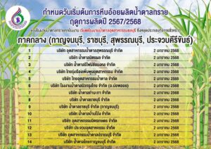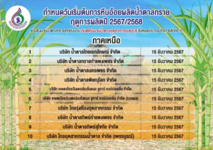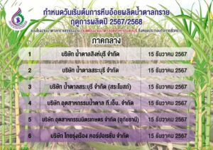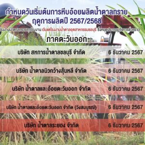 ที่ประชุมคณะกรรมการอ้อยและน้ำตาลทราย มีมติเห็นชอบกำหนดวันเปิดหีบอ้อยผลิตน้ำตาลทราย ฤดูการผลิตปี 2567/68 กำหนดเป็นรายภาค เริ่มวันที่ 6 ธันวาคม 2567