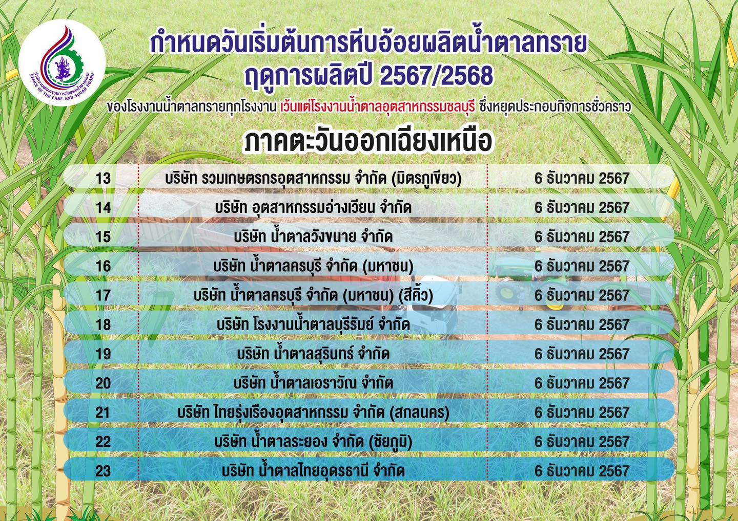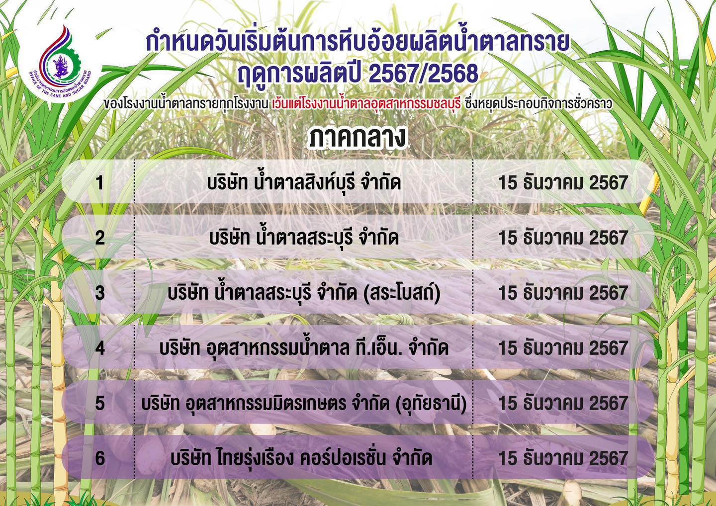 เมื่อวันที่ 26 พฤศจิกายน นายใบน้อย สุวรรณชาตรี เลขาธิการคณะกรรมการอ้อยและน้ำตาลทราย เปิดเผยว่า การประชุมคณะกรรมการอ้อยและน้ำตาลทราย (กอน.) เมื่อวันที่ 19 พฤศจิกายน ที่ผ่านมา ซึ่งมีนายณัฐพล รังสิตพล ปลัดกระทรวงอุตสาหกรรม เป็นประธาน ได้มีมติเห็นชอบกำหนดวันเปิดหีบอ้อยผลิตน้ำตาลทราย ฤดูการผลิตปี 2567/68 ของ 58 โรงงานน้ำตาลทั่วประเทศ เป็นรายภาค โดยเริ่มภาคตะวันออกและภาคตะวันออกเฉียงเหนือเป็นที่แรก คือ วันที่ 6 ธันวาคม 2567 ภาคเหนือและภาคกลาง เปิดหีบอ้อยวันที่ 15 ธันวาคม 2567 ยกเว้น 4 จังหวัด คือ กาญจนบุรี ราชบุรี สุพรรณบุรี และประจวบคีรีขันธ์ เปิดหีบอ้อยวันที่ 2 มกราคม 2568