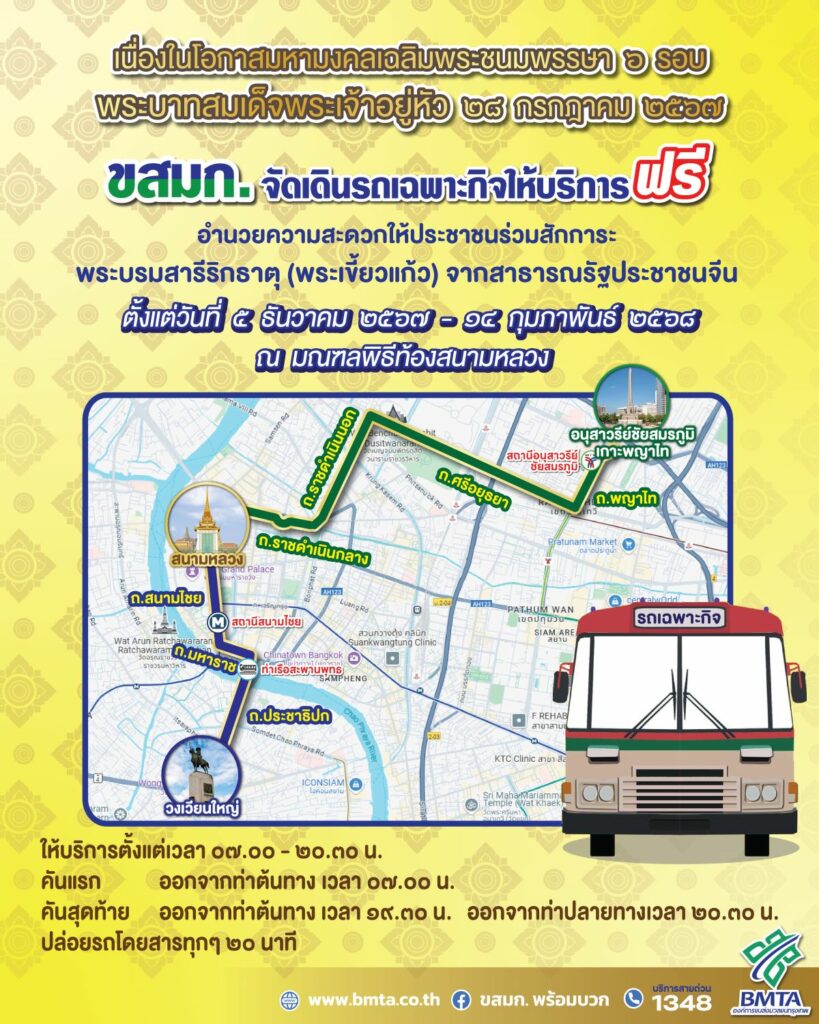 นายกิตติกานต์ จอมดวง จารุวรพลกุล ผู้อำนวยการองค์การขนส่งมวลชนกรุงเทพ กล่าวว่า ขสมก. พร้อมให้บริการประชาชน ซึ่งสอดคล้องกับนโยบายของ นายสุรพงษ์ ปิยะโชติ รัฐมนตรีช่วยว่าการกระทรวงคมนาคม ในการให้บริการที่สามารถเดินทางเชื่อมต่อระบบขนส่งสาธารณะ ล้อ ราง เรือ ได้อย่างสะดวกปลอดภัย ลดการใช้รถยนต์ส่วนตัว เพื่อลดการสร้างมลพิษทางอากาศ โดยเปิดเผยว่า รัฐบาลไทยและรัฐบาลสาธารณรัฐประชาชนจีน ได้เห็นชอบร่วมกันให้อัญเชิญพระบรมสารีริกธาตุ (พระเขี้ยวแก้ว) จากวัดหลิงกวง กรุงปักกิ่ง สาธารณรัฐประชาชนจีน มาประดิษฐาน ณ ท้องสนามหลวงกรุงเทพมหานครเป็นการชั่วคราว เพื่อเฉลิมพระเกียรติพระบาทสมเด็จพระเจ้าอยู่หัว เนื่องในโอกาสพระราชพิธีมหามงคลเฉลิมพระชนมพรรษา 6 รอบ 28 กรกฎาคม 2567 และในโอกาสครบรอบ 50 ปี แห่งการสถาปนาความสัมพันธ์ทางการทูตไทย – จีน ในปี พ.ศ. 2568 โดยเปิดให้ประชาชนสักการะพระบรมสารีริกธาตุ ระหว่างวันที่ 5 ธันวาคม 2567 ถึงวันที่ 14 กุมภาพันธ์ 2568