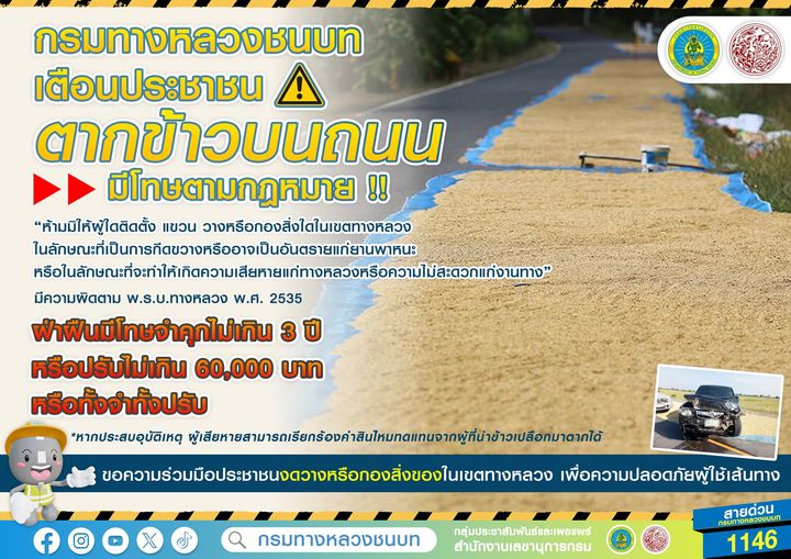 กรมทางหลวงชนบท ขอแจ้งเตือนประชาชนผู้นำข้าวเปลือกมาตากกีดขวางการจราจร มีความผิดตามพระราชบัญญัติทางหลวง พ.ศ. 2535 มาตรา 38 วรรคหนึ่ง ซึ่งหากฝ่าฝืนมีโทษตามมาตรา 72 ระวางโทษจำคุกไม่เกิน 3 ปี หรือปรับไม่เกิน 60,000 บาท หรือทั้งจำทั้งปรับ ทั้งนี้ ขอย้ำเตือนประชาชน โปรดคำนึงถึงความปลอดภัยของผู้ใช้รถใช้ถนน และประโยชน์ส่วนรวมเป็นสำคัญ หากประชาชนพบเห็นสิ่งของกีดขวางเส้นทาง โปรดแจ้งแขวงทางหลวงชนบทในพื้นที่ หรือสายด่วน กรมทางหลวงชนบท โทร. 1146