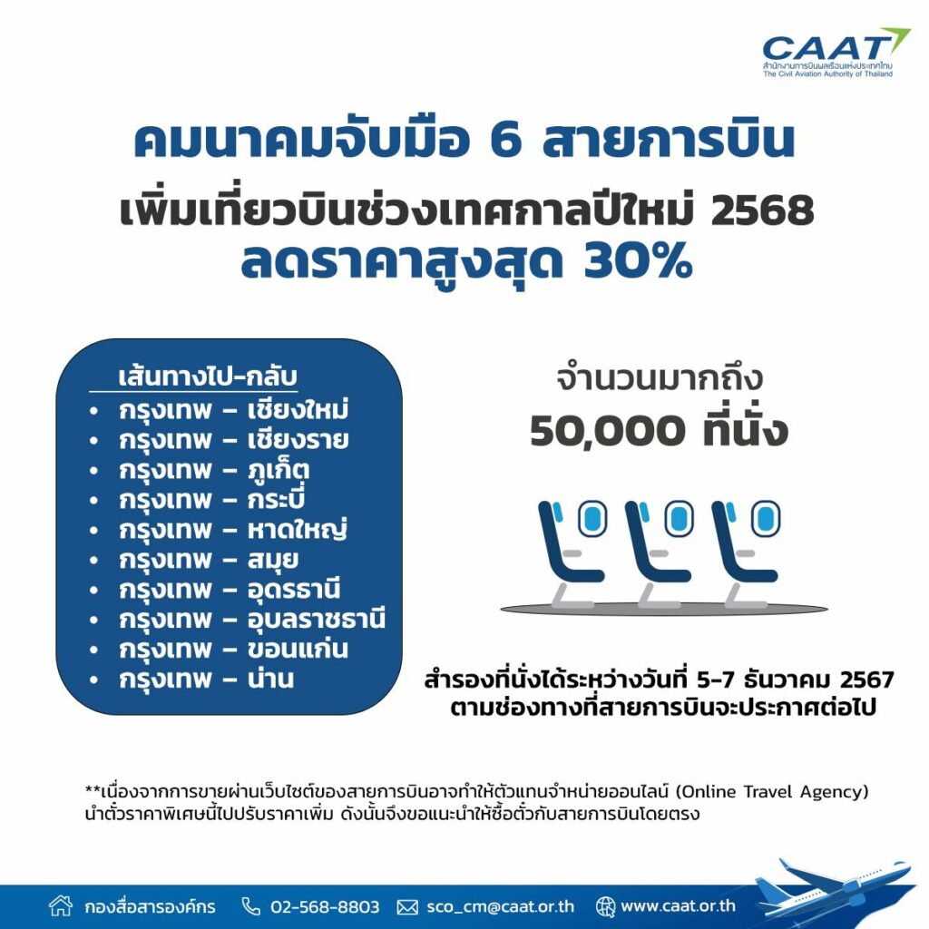 กระทรวงคมนาคม ร่วมกับ 6 สายการบิน จัดโปรโมชั่นตั๋วเครื่องบินช่วงปีใหม่ ลด 30% จำนวน 50,000 ที่นั่ง