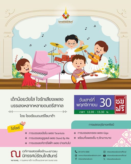 นิทรรศน์รัตนโกสินทร์ จัดเวทีการแสดงเพื่อเด็กและเยาวชน วันเสาร์ที่ 30 พฤศจิกายน 2567 เวลา 12.00 – 13.30 น. ชมฟรี ทุกวันเสาร์ – อาทิตย์ ณ เวทีการแสดงเพื่อเด็กและเยาวชน นิทรรศน์รัตนโกสินทร์ พบกับเด็กน้อยวัยใส จาก โรงเรียนดนตรีโซนาต้า มาพร้อมกับใจรักในเสียงเพลง ที่จะมาบรรเลงหลากหลายเครื่องดนตรีสากลให้ทุกคนได้รับฟังกัน