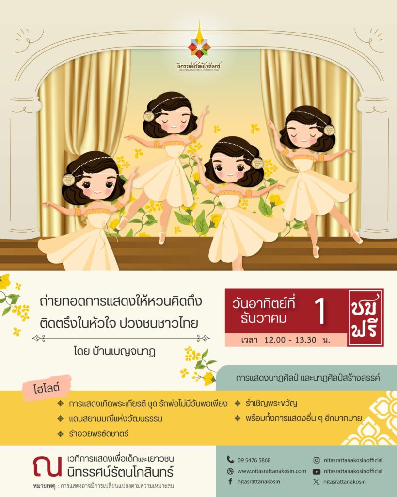 นิทรรศน์รัตนโกสินทร์ จัดเวทีการแสดงเพื่อเด็กและเยาวชน วันอาทิตย์ที่ 1 ธันวาคม 2567 เวลา 12.00 – 13.30 น. ชมฟรี ทุกวันเสาร์ – อาทิตย์ ณ เวทีการแสดงเพื่อเด็กและเยาวชน นิทรรศน์รัตนโกสินทร์ พบกับการแสดงนาฏศิลป์ และนาฏศิลป์สร้างสรรค์ โดย บ้านเบญจนาฏ ที่จะมาถ่ายทอด การแสดงให้หวนคิดถึง ติดตรึงในหัวใจ ปวงชนชาวไทย