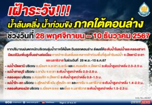 สำนักงานทรัพยากรน้ำแห่งชาติ ประกาศ เฝ้าระวังน้ำล้นตลิ่ง น้ำท่วมขัง ภาคใต้ตอนล่าง จากปริมาณฝนตกหนักบริเวณลุ่มน้ำภาคใต้ฝั่งตะวันออกตอนล่าง ช่วงวันที่ 28 พฤศจิกายน – 10 ธันวาคม 2567