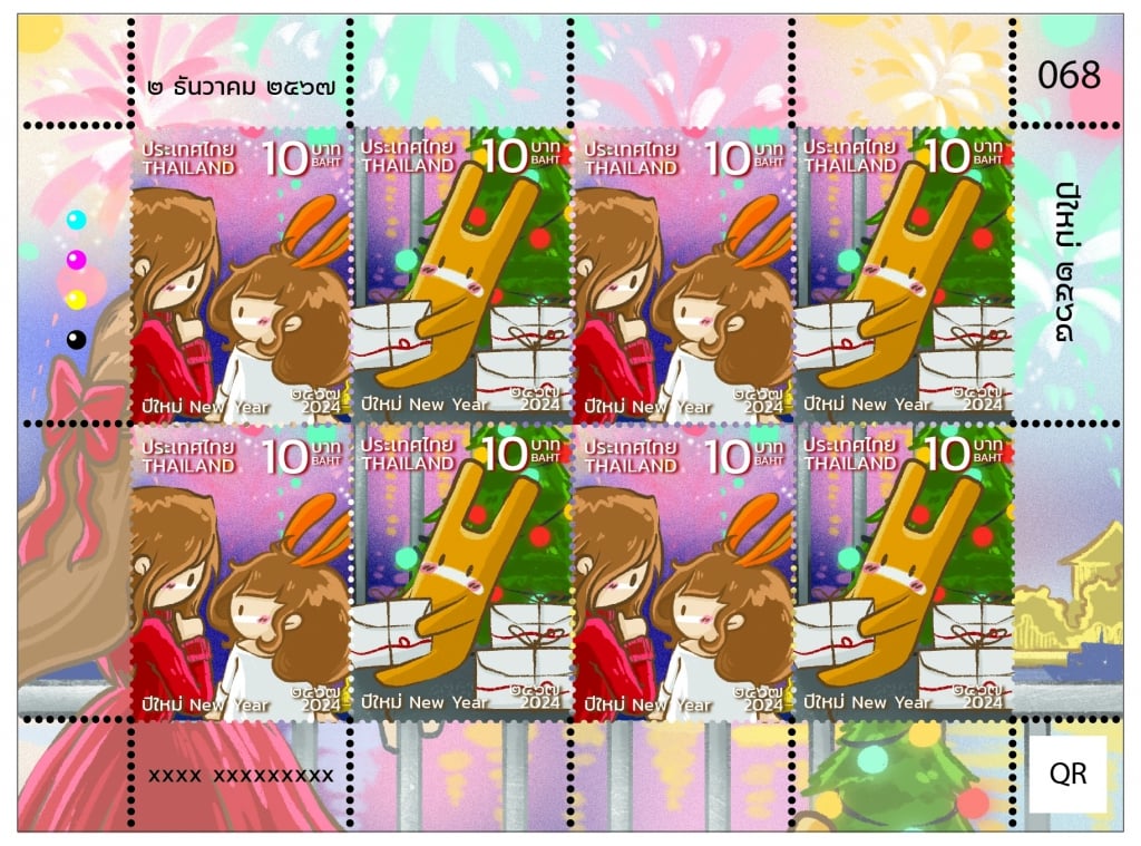 สำหรับแสตมป์ชุดปีใหม่ 2568 นี้ มาในคอนเซ็ปต์ “Memories on the Rooftop” บอกเล่าเรื่องราวในคืนเคาท์ดาวน์ ที่ตัวศิลปินและเด็กหญิงหูยาวยืนมองทิวทัศน์วัดอรุณในยามค่ำคืนจากบนดาดฟ้ามีฉากหลังเป็นพลุฉลองปีใหม่พร้อมนึกย้อนเรื่องราวในอดีตตลอดปีที่ผ่านมาอย่างมีความสุข โดยมี “เมลโล่” กระต่ายน้อยแกะกล่องพัสดุอยู่ข้างๆ แสตมป์ชุดนี้มี 2 แบบ ราคาดวงละ 10 บาท (เต็มแผ่น 8 ดวง) แผ่นชีตที่ระลึกราคา 40 บาท ซองวันแรกจำหน่ายราคา 34 บาท เริ่มจำหน่าย 2 ธ.ค. 2567 ที่ไปรษณีย์ในกรุงเทพ ไปรษณีย์ประจำจังหวัด พิพิธภัณฑ์แสตมป์ไทย (BTS สะพานควาย) และทางออนไลน์ผ่านเว็บไซต์หรือแอปพลิเคชัน Thailandpostmart สอบถามเพิ่มเติมฝ่ายบริหารลูกค้าและพัฒนาผลิตภัณฑ์บริการไปรษณีย์ โทร. 0 2573 5480 , 0 2573 5463