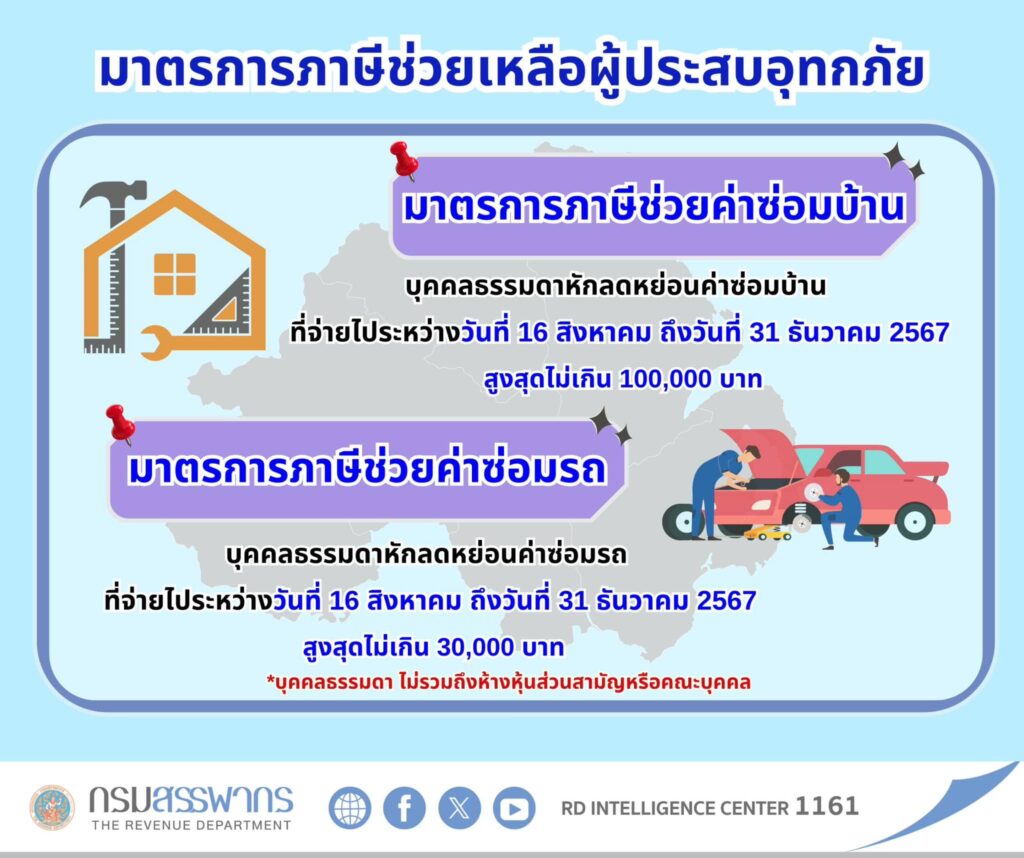 กรมสรรพากร ออกมาตรการภาษีช่วยค่าซ่อมบ้านและมาตรการภาษีช่วยค่าซ่อมรถ เพื่อบรรเทาภาระค่าใช้จ่ายในการซ่อมแซมทรัพย์สิน ที่ได้รับความเสียหายจากอุทกภัย* ตั้งแต่วันที่ 16 สิงหาคม 2567 เป็นต้นมมา