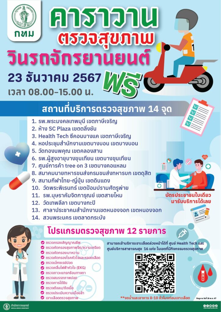 กรุงเทพมหานคร จัดคาราวานตรวจสุขภาพฟรี สำหรับวินจักรยานยนต์ ในวันที่ 23 ธันวาคม 2567