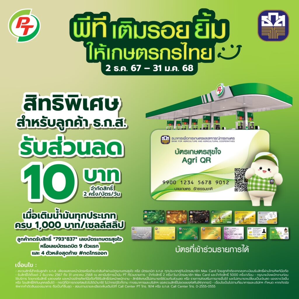 ธนาคารเพื่อการเกษตรและสหกรณ์การเกษตร (ธ.ก.ส.) ร่วมกับ บริษัท แมกซ์ โซลูชัน เซอร์วิส จำกัด จัดแคมเปญสุดพิเศษ เพื่อช่วยแบ่งเบาภาระค่าใช้จ่ายให้ลูกค้า ธ.ก.ส. ผู้ถือบัตรเกษตรสุขใจ หรือบัตรเดบิต ธ.ก.ส. ทุกประเภท คู่กับบัตรสมาชิก Max Card รับสิทธิพิเศษเมื่อเติมน้ำมัน และชำระค่าน้ำมันทุกประเภทตั้งแต่ 1,000 บาทขึ้นไป/เซลล์สลิป รับส่วนลดทันที 10 บาท ณ สถานีบริการน้ำมัน PT ทุกสาขาทั่วประเทศ ตั้งแต่วันที่ 2 ธันวาคม 2567 – 31 มกราคม 2568 เพียงลูกค้ากดลงทะเบียนรับสิทธิ์ผ่านโทรศัพท์มือถือ *793*837* ตามด้วยเลขบัตรเกษตรสุขใจ หรือเดบิต ธ.ก.ส. 9 หลักแรก และ 4 หลักสุดท้าย กด # แล้วโทรออก ทั้งนี้ จำกัดสิทธิ์ 2 ครั้ง/เดือน/บัตรสมาชิก Max Card และจำกัดสิทธิ์รวม 5,000 ครั้ง/เดือน ติดต่อสอบถามรายละเอียดเพิ่มเติมได้ที่ Call Center 02 555 0555 หรือ Call Center PT โทร. 1614