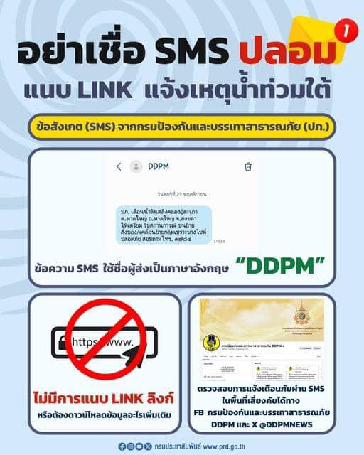 อย่างไรก็ตามเพื่อเป็นการป้องกันความสับสนและให้ประชาชนเชื่อมั่นว่าเป็นข้อความดังกล่าวเป็นข้อความจากหน่วยงานของรัฐจริง กรมป้องกันและบรรเทาสาธารณภัย (ปภ.) จึงขอแจ้งให้ประชาชนทราบว่าข้อความแจ้งเตือนภัยที่ส่งไปยังโทรศัพท์มือถือของประชาชนในพื้นที่ประสบภัยจะส่งในนามชื่อของ DDPM เท่านั้น และจะไม่มีการแนบลิงก์ให้ประชาชนกดเข้าไปดำเนินการใด ๆ ทั้งสิ้น และขอให้ประชาชนที่ได้รับความแจ้งเตือนภัยเชื่อมั่นและปฏิบัติตามคำแนะนำของทางราชการอย่างเคร่งครัดเพื่อความปลอดภัยในชีวิตและทรัพย์สินของตัวท่านเอง”