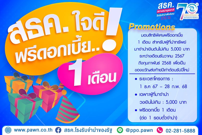 - สำนักงานธนานุเคราะห์ โรงรับจำนำเพื่อสังคม มอบสิทธิพิเศษฟรีดอกเบี้ย 1 เดือนเต็ม สำหรับผู้ที่นำทรัพย์สินมาจำนำเงินต้นไม่เกิน 5,000 บาท