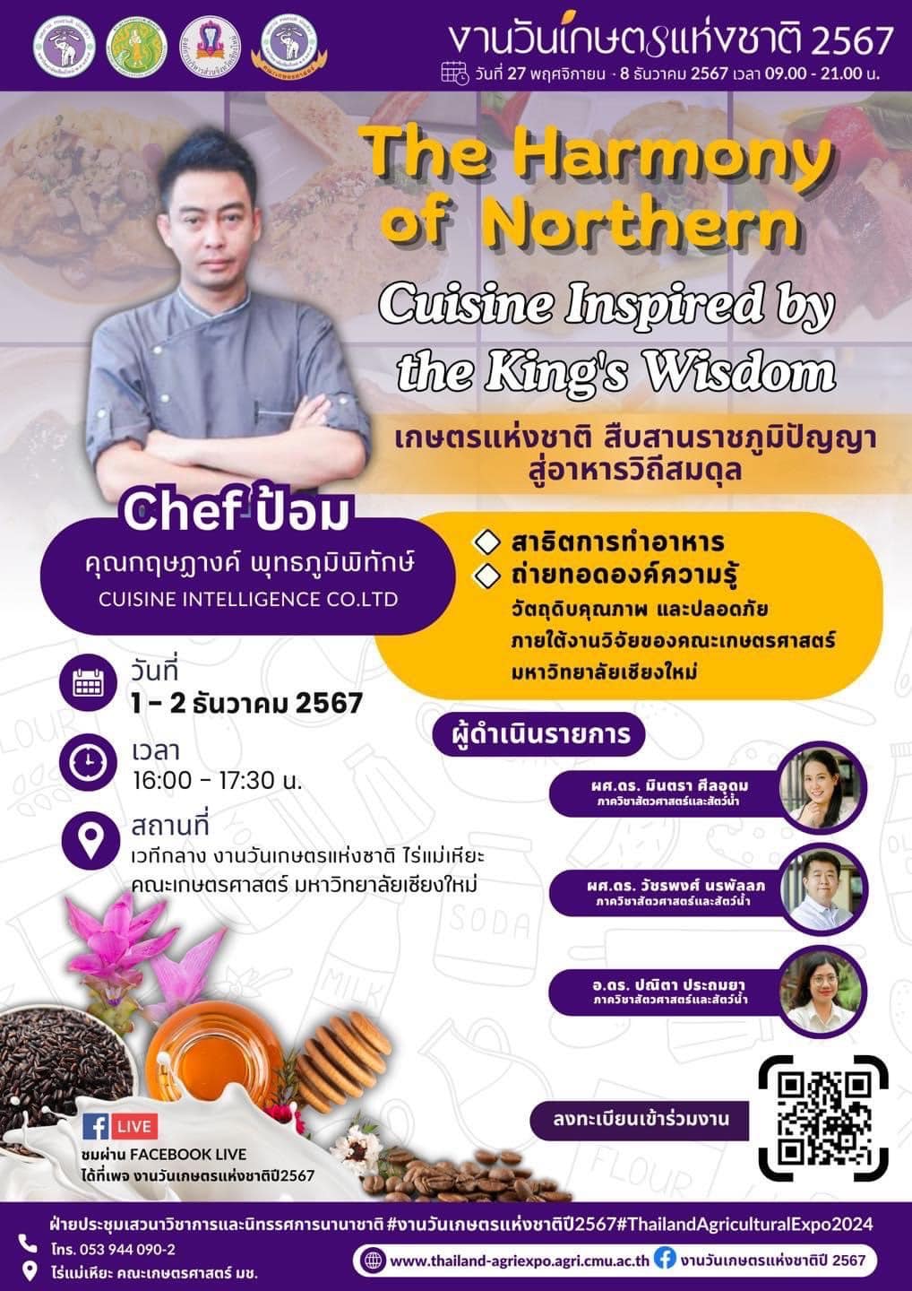 เชิญพบกับเสวนาวิชาการ หัวข้อเรื่อง “The Harmony of Northern Cuisine Inspired by the King’s Wisdom: เกษตรแห่งชาติ สืบสานราชภูมิปัญญาสู่อาหารวิถีสมดุล” โดย เชฟป้อม กฤษฏางค์ พุทธภูมิพิทักษ์ เชฟมากประสบการณ์ด้านอาหารและขนมหวานทั้งในและต่างประเทศมากกว่า 10 ปี จากสถาบันสอนทำอาหาร cuisinephile – CUISINE INTELLIGENCE CO.LTD ที่จะมารังสรรค์เมนูจากวัตถุดิบคุณภาพ และปลอดภัย ภายใต้งานวิจัยของคณะเกษตรศาสตร์ มหาวิทยาลัยเชียงใหม่ อาทิ ข้าวก่ำเจ้า มช.107 ปลานิลปลอดภัย น้ำผึ้งชันโรง น้ำนมโคคุณภาพสูงล้านนา กาแฟ CMU Coffee ดอกปทุมมา เป็นต้น