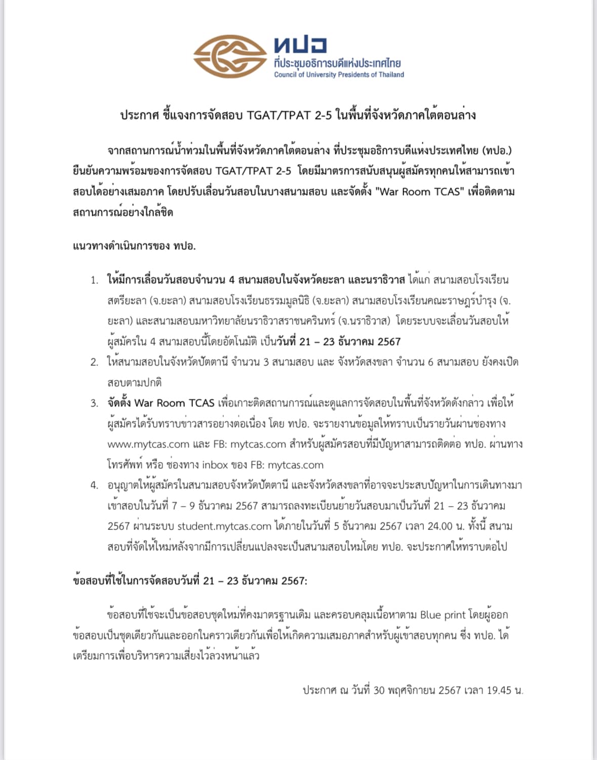 จากสถานการณ์น้ำท่วมในพื้นที่จังหวัดภาคใต้ตอนล่าง ที่ประชุมอธิการบดีแห่งประเทศไทย (ทปอ.) ยืนยันความพร้อมของการจัดสอบ TGAT/TPAT 2-5 โดยมีมาตรการสนับสนุนผู้สมัครทุกคนให้สามารถเข้าสอบได้อย่างเสมอภาค โดยปรับเลื่อนวันสอบในบางสนามสอบ และจัดตั้ง “War Room TCAS” เพื่อติดตามสถานการณ์อย่างใกล้ชิด