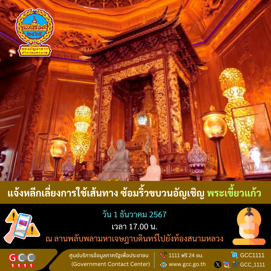 กองบัญชาการตำรวจนครบาล แจ้งหลีกเลี่ยงการใช้เส้นทาง ซ้อมริ้วขบวนอัญเชิญ พระเขี้ยวแก้ว วัน 1 ธันวาคม 2567 เวลา 17.00 น. ณ ลานพลับพลามหาเจษฎาบดินทร์ไปยังท้องสนามหลวง ทั้งนี้ ผู้ใช้รถใช้ถนนโปรดวางแผนการเดินทางหรือหลีกเลี่ยงการใช้เส้นทางดังกล่าว