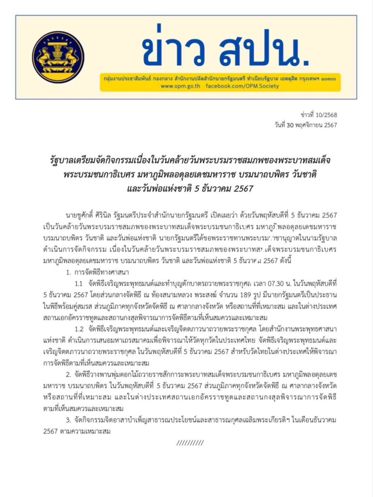 รัฐบาล เตรียมจัดกิจกรรมเนื่องในวันคล้ายวันพระบรมราชสมภพของพระบาทสมเด็จพระบรมชนกาธิเบศร มหาภูมิพลอดุลยเดชมหาราช บรมนาถบพิตร วันชาติ และวันพ่อแห่งชาติ 5 ธันวาคม 2567