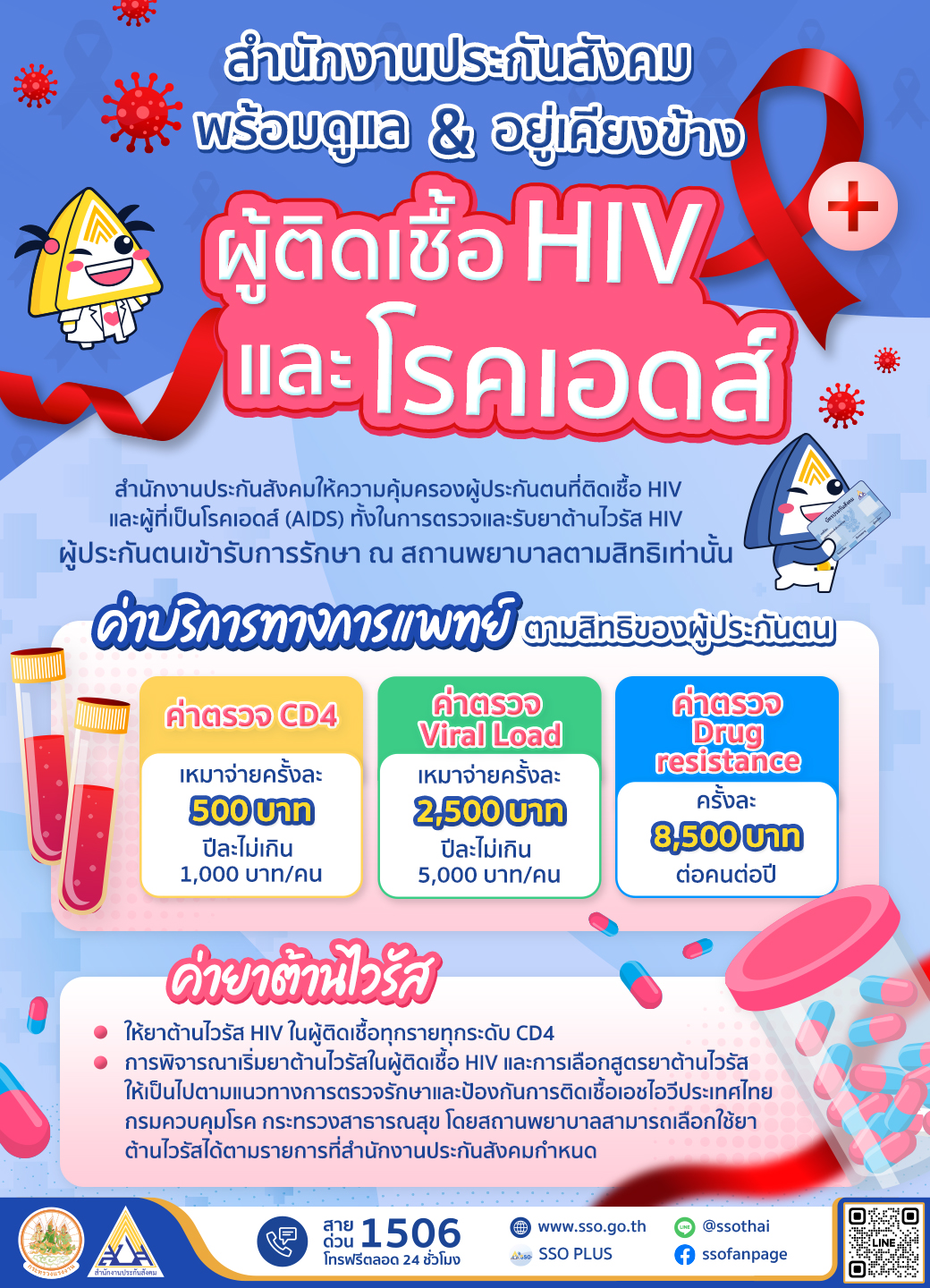 สำนักงานประกันสังคม พร้อมดูแลและอยู่เคียงข้างผู้ติดเชื้อ HIV และโรคเอดส์ มีสิทธิประโยชน์ให้กับผู้ประกันตนที่ติดเชื้อ โดยแบ่งเป็นค่าบริการทางการแพทย์และค่ายาต้านไวรัส