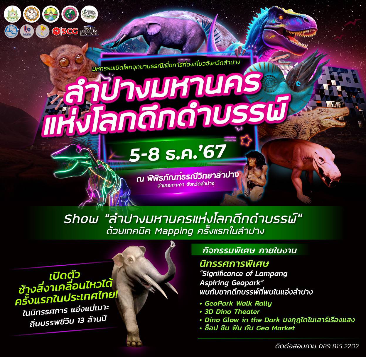 ททท.สำนักงานลำปาง ชวนเที่ยวงาน มหกรรมเปิดโลกอุทยานธรณี เพื่อการท่องเที่ยวจังหวัดลำปาง ในวันที่ 5 – 8 ธันวาคม 2567 ตั้งแต่เวลา 17.00 – 22.00 น. ณ พิพิธภัณฑ์ธรณีวิทยา อำเภอเกาะคา จังหวัดลำปาง