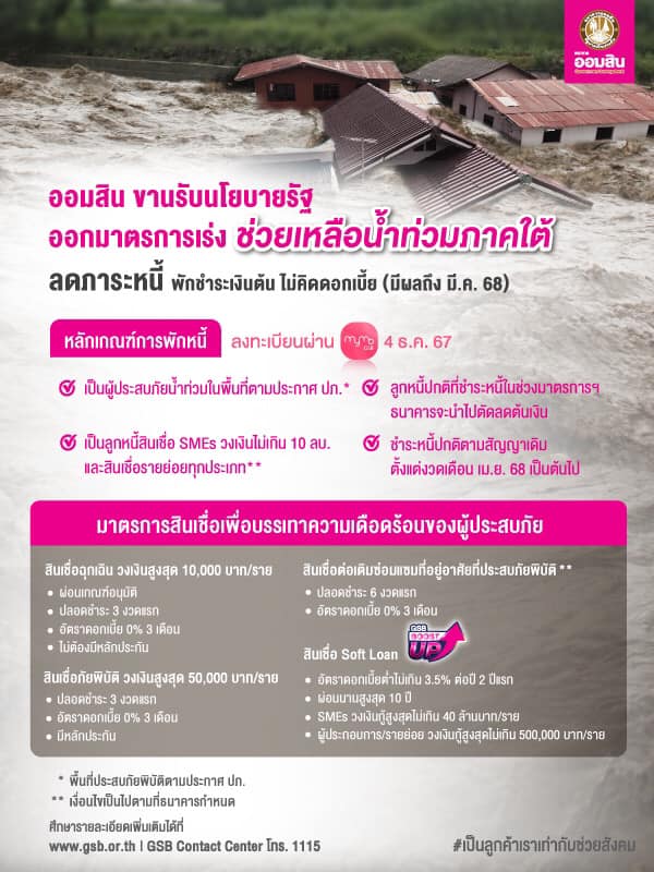 ธนาคารพร้อมสนับสนุนมาตรการช่วยเหลือและบรรเทาความเดือดร้อนให้ผู้ประสบภัยตามนโยบายรัฐบาลอย่างต่อเนื่อง และขอร่วมส่งกำลังใจให้ผู้ประสบภัยในทุกพื้นที่ผ่านพ้นวิกฤตในครั้งนี้โดยเร็ว สอบถามรายละเอียดเพิ่มเติมได้ที่ GSB Contact Center โทร.1115 และที่เว็บไซต์ www.gsb.or.th