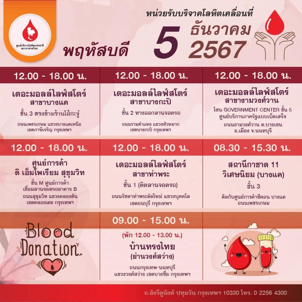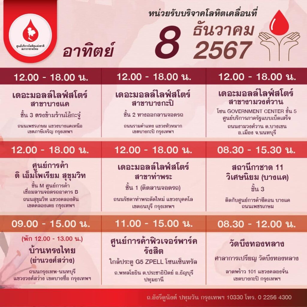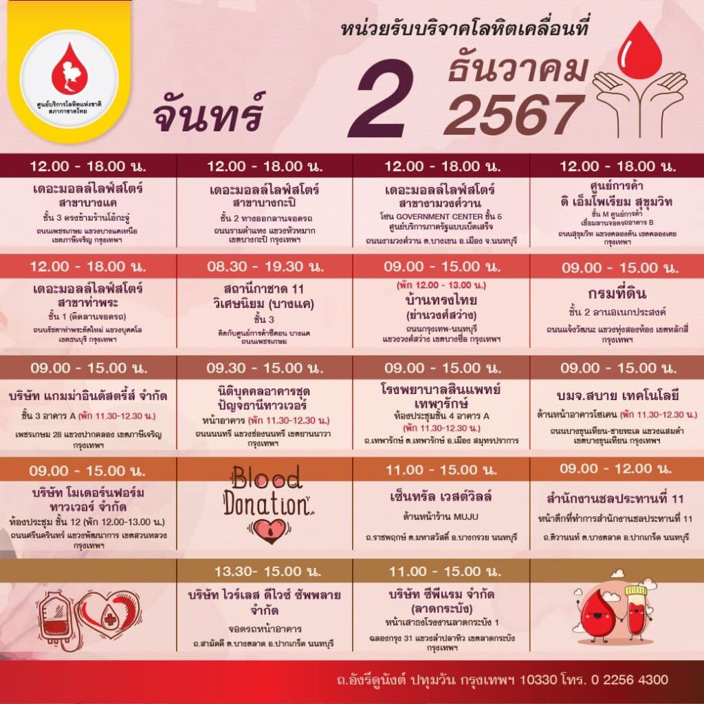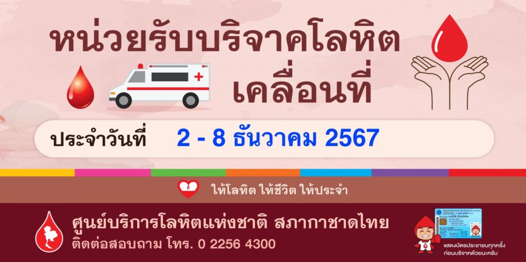 สภากาชาดไทย ออกหน่วยรับบริจาคโลหิตเคลื่อนที่ วันที่ 2 – 8 ธันวาคม 2567