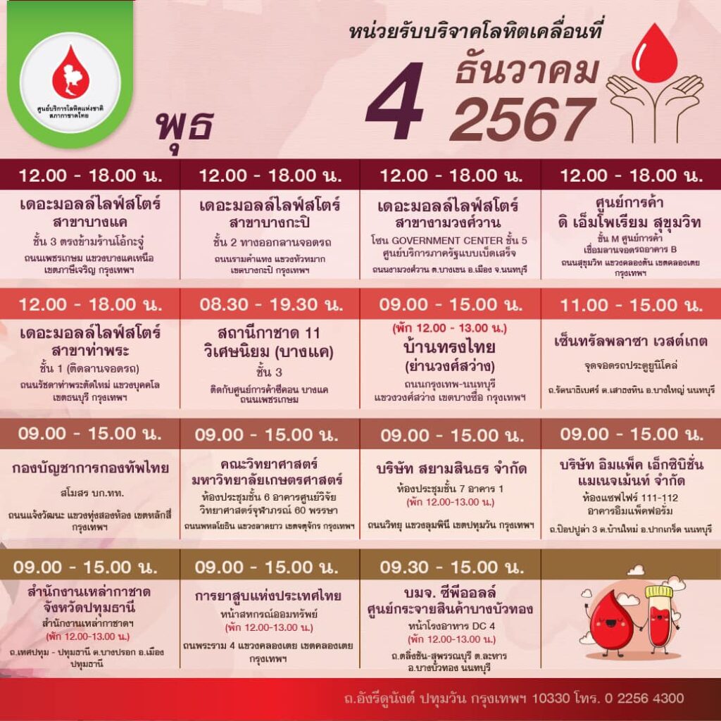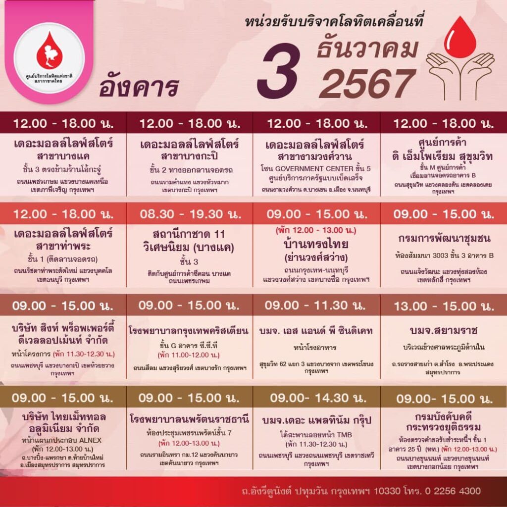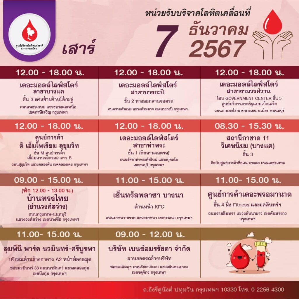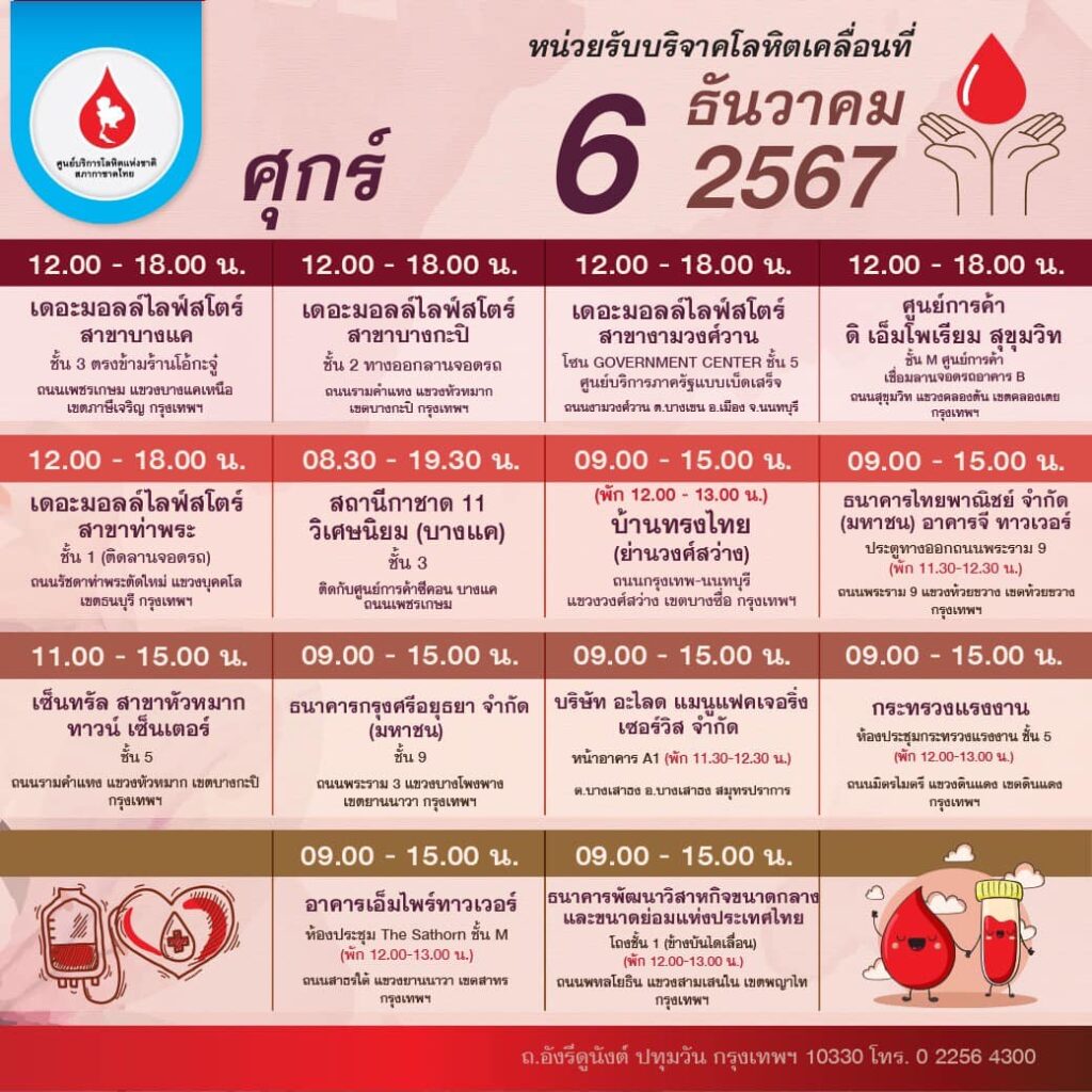 สภากาชาดไทย ออกหน่วยรับบริจาคโลหิตเคลื่อนที่ วันที่ 2 – 8 ธันวาคม 2567