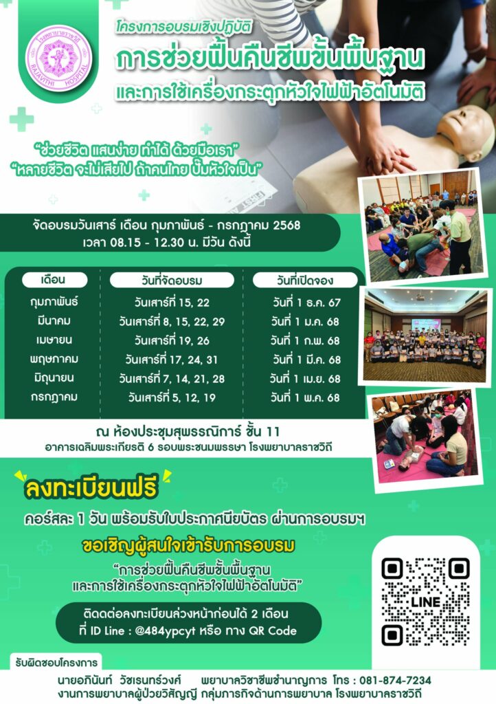 โรงพยาบาลราชวิถี โดยงานการพยาบาลผู้ป่วยวิสัญญี ภารกิจด้านการพยาบาล ขอเชิญผู้สนใจเข้าร่วมโครงการอบรมเชิงปฏิบัติการ “การช่วยฟื้นคืนชีพขั้นพื้นฐานและการใช้เครื่องกระตุกหัวใจไฟฟ้าอัตโนมัติ” โดยจัดอบรมวันเสาร์ เดือนกุมภาพันธ์ – กรกฎาคม 2568 เวลา 08.15 – 12.30 น. ณ ห้องประชุมสุพรรณิการ์ ชั้น 11 อาคารเฉลิมพระเกียรติฯ โรงพยาบาลราชวิถี