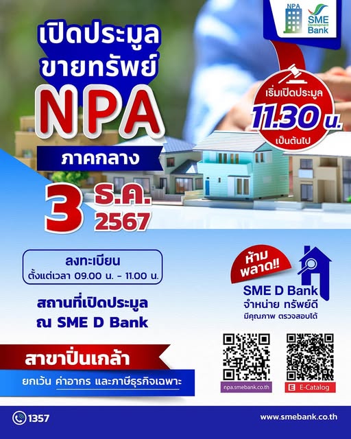 SME D Bank จัดงานประมูลขายทรัพย์ NPA ภาคกลาง ในวันที่ 3 ธันวาคม 2567