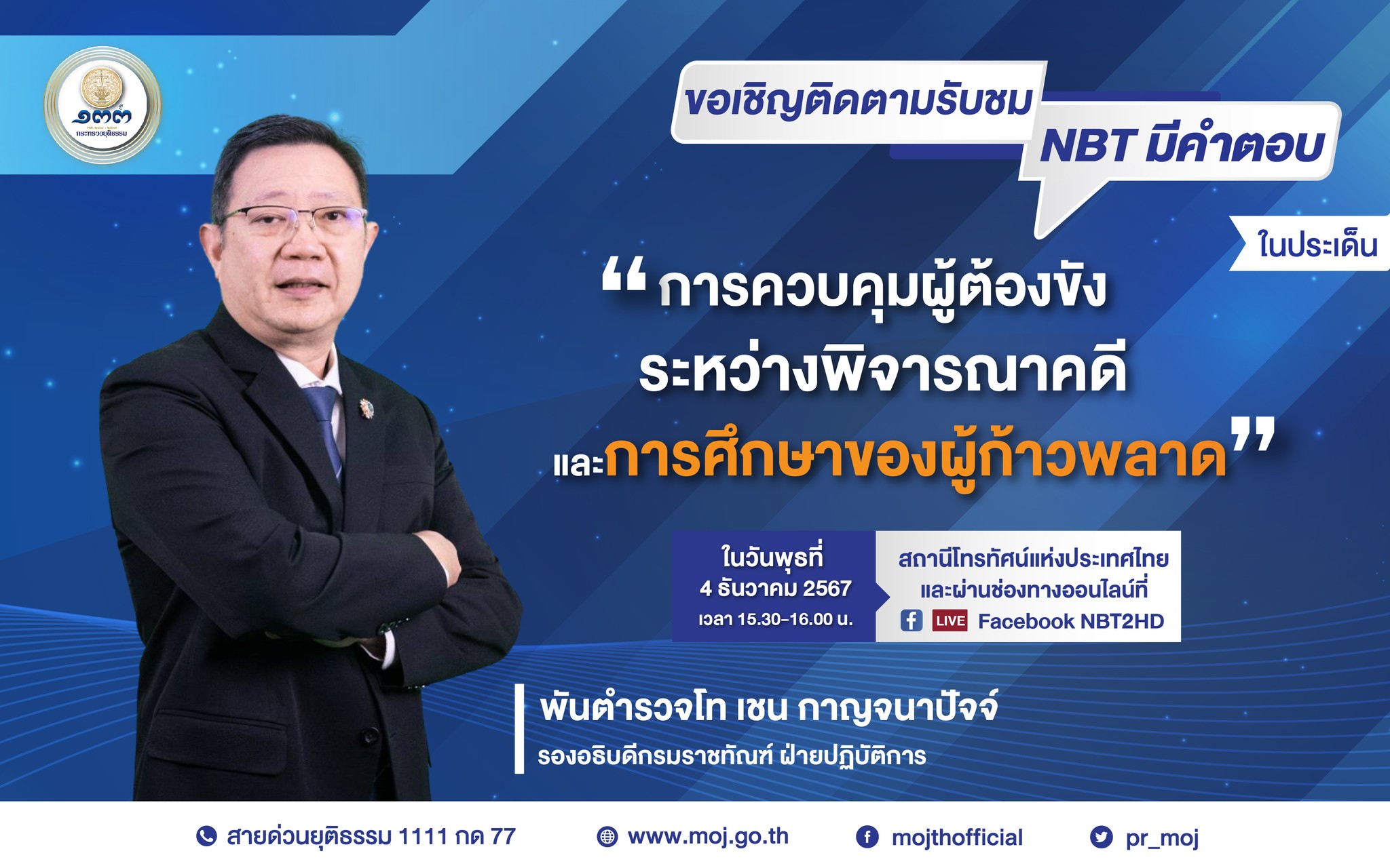 กระทรวงยุติธรรม จัดรายการ “NBT มีคำตอบ” ในประเด็น “การควบคุมผู้ต้องขังระหว่างพิจารณาคดี และการศึกษาของผู้ก้าวพลาด” วันที่ 4 ธันวาคม 2567 เวลา 15.30 – 16.00 น. ทางสถานีวิทยุโทรทัศน์แห่งประเทศไทย NBT หรือ LIVE ช่องทางการรับชม : Live NBT2HD โดย พันตำรวจโท เชน กาญจนาปัจจ์ รองอธิบดีกรมราชทัณฑ์ ฝ่ายปฏิบัติการ