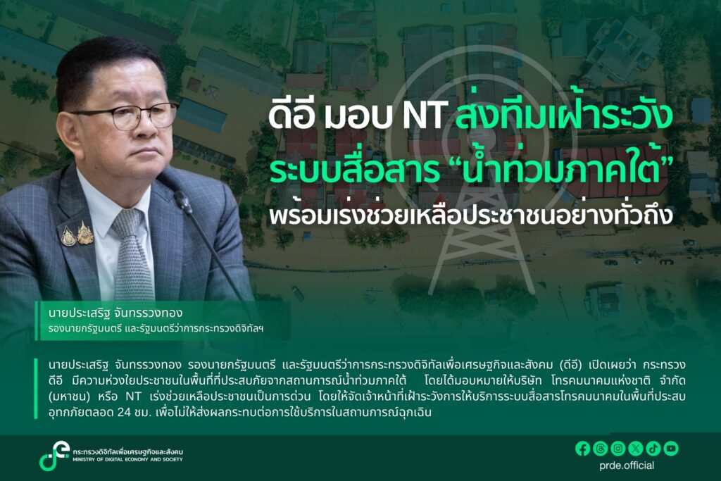 กระทรวงดิจิทัลเพื่อเศรษฐกิจและสังคม มอบหมายให้บริษัท โทรคมนาคมแห่งชาติ จำกัด (มหาชน) หรือ NT ส่งทีมเฝ้าระวังระบบสื่อสาร “น้ำท่วมภาคใต้” พร้อมเร่งช่วยเหลือประชาชนอย่างทั่วถึง