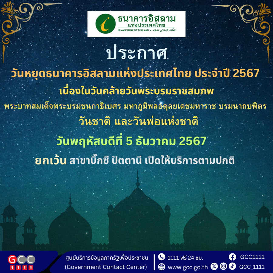 ธนาคารอิสลามแห่งประเทศไทย ประกาศเรื่อง วันหยุดตามประเพณีของธนาคารอิสลามแห่งประเทศไทย ประจำปี พ.ศ. 2567 เนื่องในวันคล้ายวันพระบรมราชสมภพของพระบาทสมเด็จพระบรมชนกาธิเบศร มหาภูมิพลอดุลยเดชมหาราช บรมนาถบพิตร วันชาติ และวันพ่อแห่งชาติ วันที่ 5 ธันวาคม 2567 ยกเว้น สาขาบิ๊กซี ปัตตานี เปิดให้บริการตามปกติ