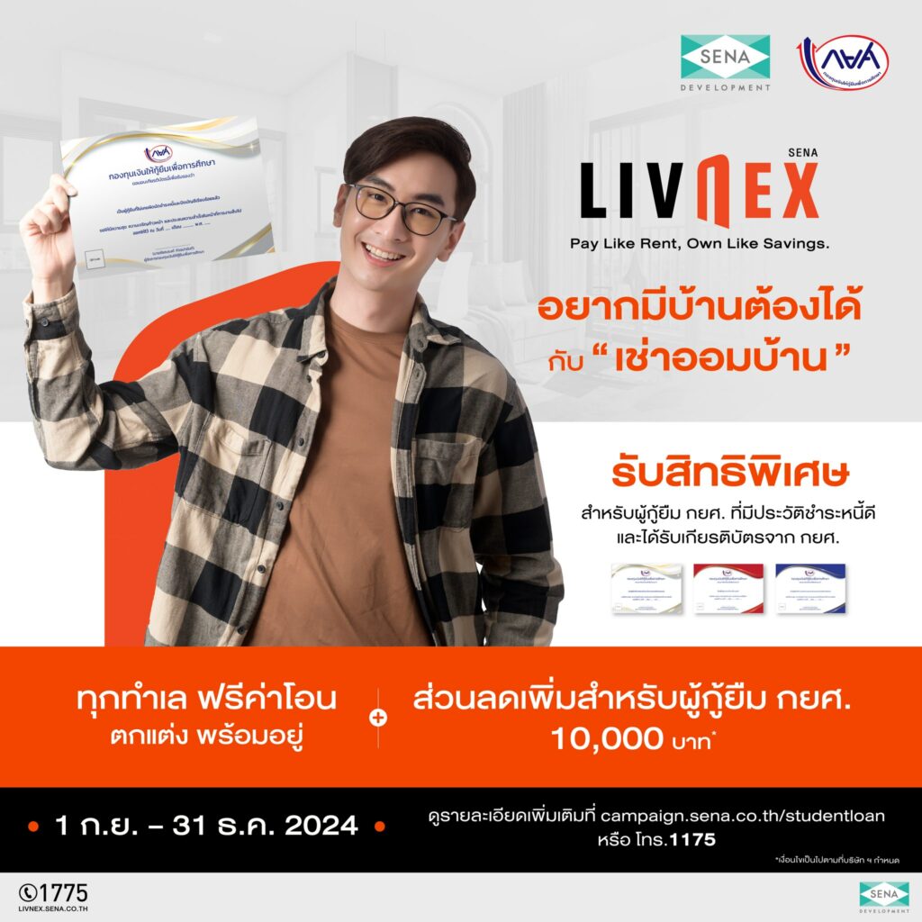 บริษัท เสนาดีเวลลอปเม้นท์ จำกัด (มหาชน) ร่วมกับ กองทุนเงินให้กู้ยืมเพื่อการศึกษา จัดแคมเปญ “สิทธิพิเศษแก่ผู้กู้ยืมกองทุนเงินให้กู้ยืมเพื่อการศึกษา (กยศ.) ที่ได้รับเกียรติบัตรชำระหนี้ดี” สามารถเข้าร่วมโครงการ LivNex และเป็นเจ้าของบ้านเสนาได้ง่าย ๆ เพียงแสดงเกียรติบัตรที่ได้รับจาก กยศ. ซึ่งจะได้รับสิทธิพิเศษที่คอนโดของเสนาในกว่า 20 โครงการ ทั่วกรุงเทพฯ เช่น สุขุมวิท รามคำแหง บางนา แจ้งวัฒนะ รังสิต เป็นต้น
