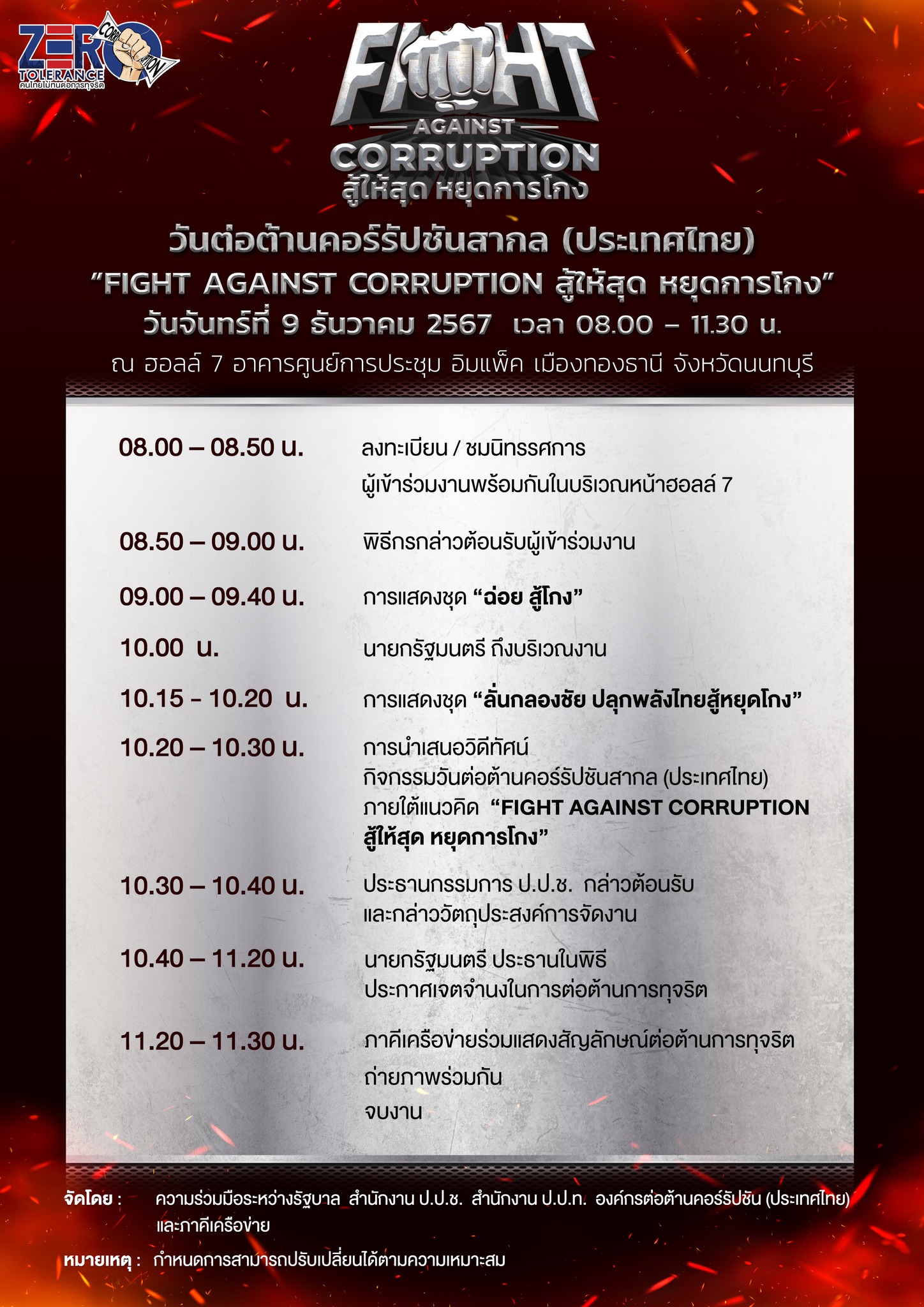 - จัดโดย : ความร่วมมือระหว่างรัฐบาล สำนักงาน ป.ป.ช. สำนักงาน ป.ป.ท. องค์กรต่อต้านคอร์รัปชัน (ประเทศไทย) และภาคีเครือข่าย