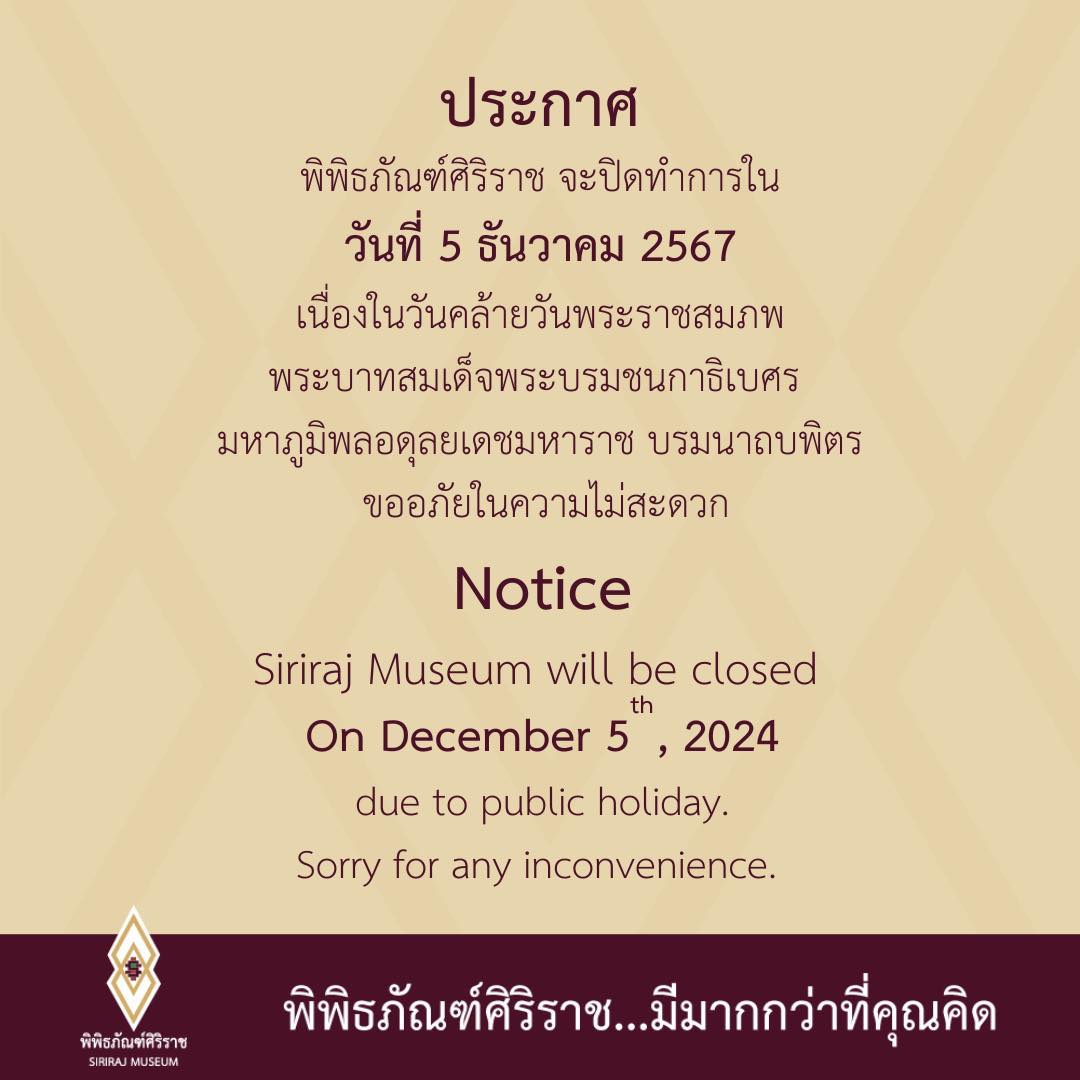 พิพิธภัณฑ์ศิริราช แจ้งปิดทำการ เนื่องในวันพระราชสมภพ พระบาทสมเด็จพระบรมชนกาธิเบศร มหาภูมิพลอดุลยเดชมหาราช บรมนาถบพิตร วันที่ 5 ธันวาคม 2567
