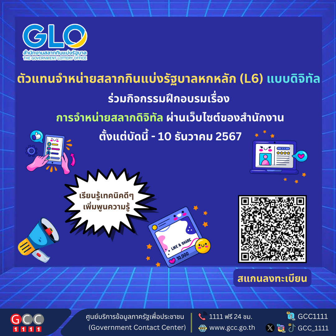 สำนักงานสลากกินแบ่งรัฐบาล แจ้งตัวแทนจำหน่ายสลากกินแบ่งรัฐบาลหกหลัก (L6) แบบดิจิทัล เข้าร่วมกิจกรรมฝึกอบรม เรื่อง การจำหน่ายสลากดิจิทัลผ่านเว็บไซต์ของสำนักงาน ตั้งแต่บัดนี้ – 10 ธันวาคม 2567