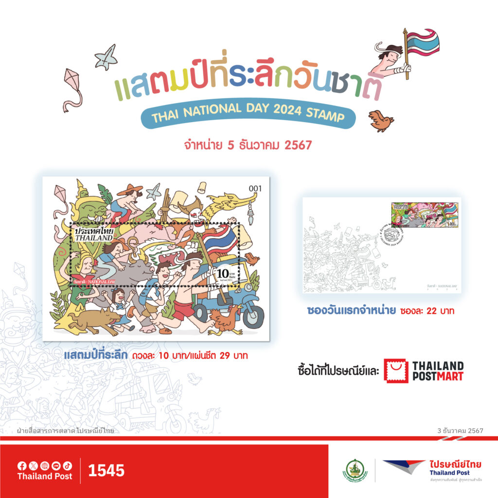 บริษัท ไปรษณีย์ไทย จำกัด ร่วมเฉลิมฉลองวันชาติไทย พร้อมเปิดตัวแสตมป์ชุดใหม่ที่มี ตัวละครเอกลักษณ์ไทย ซึ่งได้รับการออกแบบโดย “KAMO – นัทพล โกมลารชุน” ศิลปินรุ่นใหม่ที่ใช้สไตล์ Doodle Art ในการวาดภาพ โดยการนำองค์ประกอบเล็กๆ มาต่อกันจนกลายเป็นภาพใหญ่ที่ดูสนุกและอบอุ่นในเวลาเดียวกัน แสตมป์ชุดนี้มาในคอนเซปต์การเฉลิมฉลองวันชาติอย่างภาคภูมิใจ ผ่านคาแรคเตอร์ที่แสดงเอกลักษณ์ของไทย เช่น ผีตาโขน , ทศกัณฐ์ , หนุมาน และ นักมวย ทุกตัวละครต่างสนุกสนานและเดินหน้าไปข้างหน้าด้วยกัน