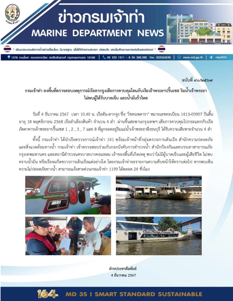 กรมเจ้าท่า ลงพื้นที่ตรวจสอบเหตุการณ์เรือลากจูงเสียการควบคุมโดนกับเรือเจ้าพระยาปริ๊นเซส ริมน้ำเจ้าพระยาไม่พบผู้ได้รับบาดเจ็บ และน้ำมันรั่วไหล วันที่ 4 ธันวาคม 2567 เวลา 10.40 น. เรือดัน-ลากจูง ชื่อ “โชคนพดารา” หมายเลขทะเบียน 1413-00907 วันสิ้นอายุ 18 พฤศจิกายน 2568 เรือลำเลียงสินค้า จำนวน 4 ลำ ผ่านขึ้นสะพานกรุงเทพฯ เสียการควบคุมไปกระแทกกับเรือภัตตาคารเจ้าพระยาปริ๊นเซส 1 , 2 , 3 , 7 และ 8 ที่ผูกจอดอยู่ริมแม่น้ำเจ้าพระยาฝั่งธนบุรี ได้รับความเสียหายจำนวน 4 ลำ