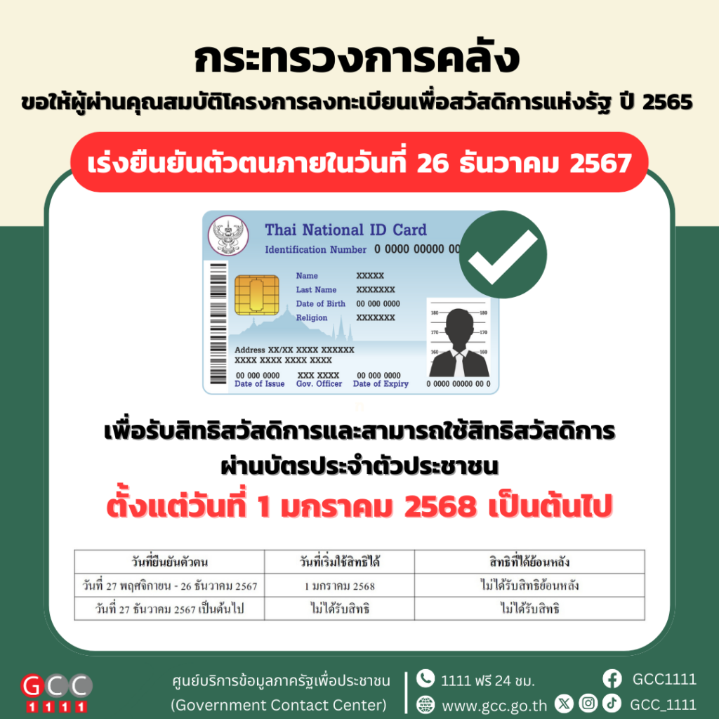 กระทรวงการคลัง แจ้งเตือนผู้ผ่านคุณสมบัติตามโครงการลงทะเบียนเพื่อสวัสดิการแห่งรัฐ (โครงการฯ) ปี 2565 ที่ยังไม่ได้ยืนยันตัวตน ขอให้รีบมายืนยันตัวตนเพื่อใช้สิทธิสวัสดิการแห่งรัฐ ตั้งแต่บัดนี้ – 26 ธันวาคม 2567 เพื่อรับสิทธิสวัสดิการและใช้สิทธิสวัสดิการผ่านบัตรประจำตัวประชาชนได้ตั้งแต่วันที่ 1 มกราคม 2568 เป็นต้นไป