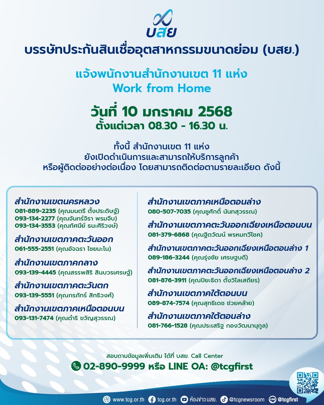 บรรษัทประกันสินเชื่ออุตสาหกรรมขนาดย่อม แจ้งการให้บริการของสำนักงานเขตในรูปแบบ Work from Home จำนวน 11 แห่ง ในวันที่ 10 มกราคม 2568 ตั้งแต่เวลา 08.30 น. – 16.30 น.