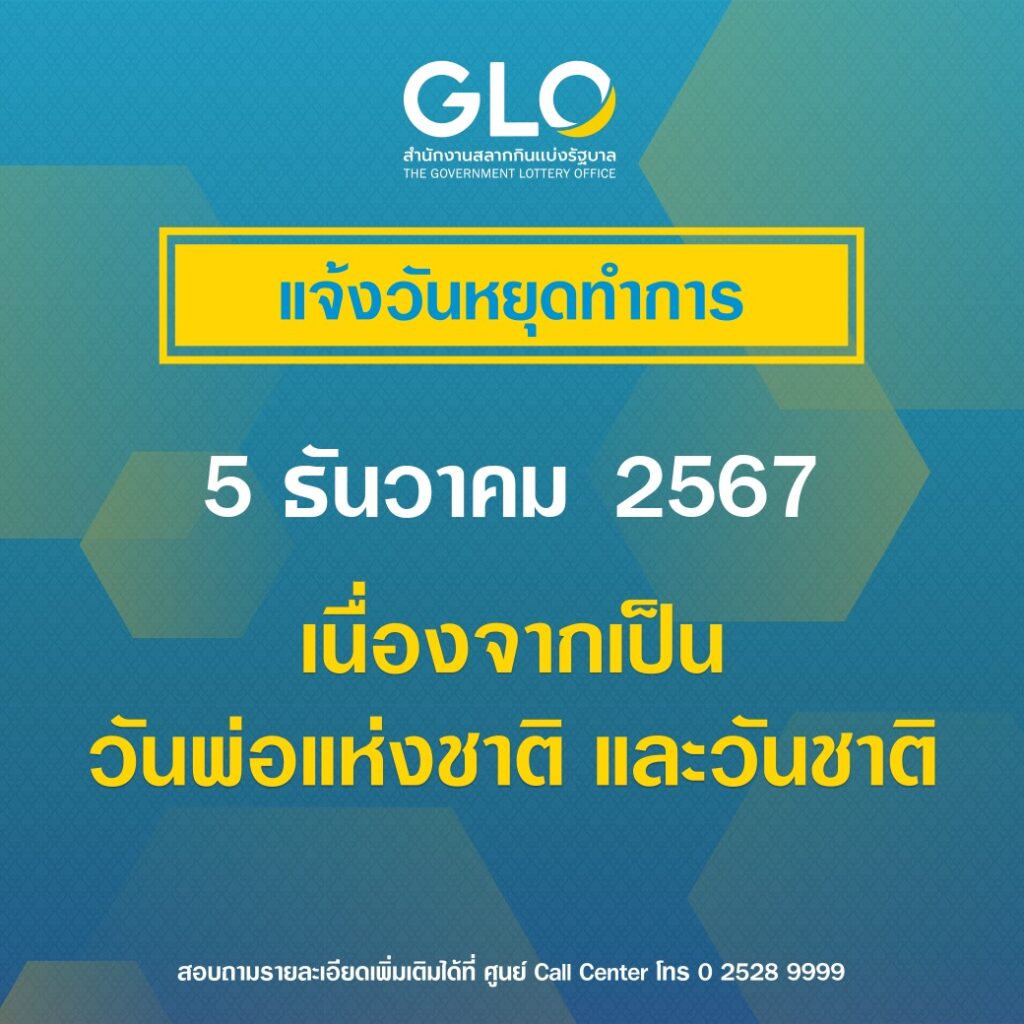 สำนักงานสลากกินแบ่งรัฐบาล ขอแจ้งวันหยุดทำการ ในวันที่ 5 ธันวาคม 2567 เนื่องจากเป็นวันพ่อแห่งชาติ และวันชาติ